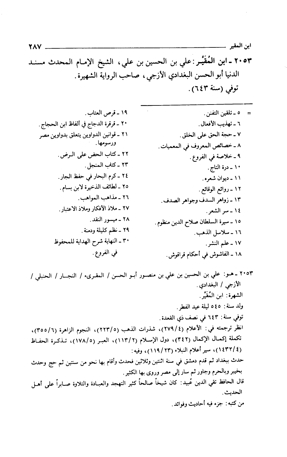 ابن المقير: علي بن الحسين بن علي، الشيخ الإمام المحدث مسند الدنيا أبو الحسن البغدادي الأزجي، صاحب الوراية الشهيرة.