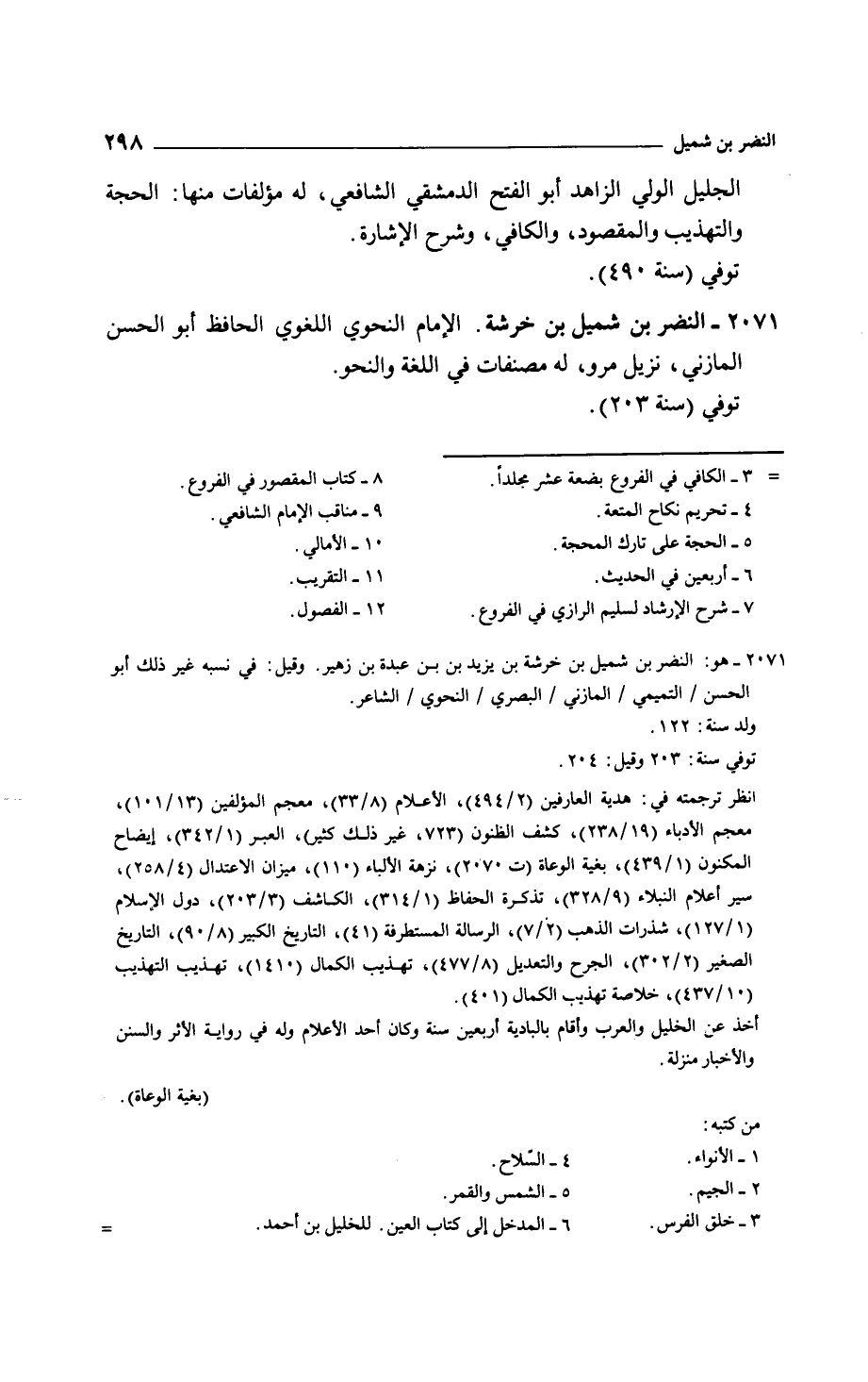 النضر بن شميل بن خرشة. الإمام النحوي اللغوي الحافظ أبو الحسن المازني، نزيل مرو، له مصنفات في اللغة والنحو.