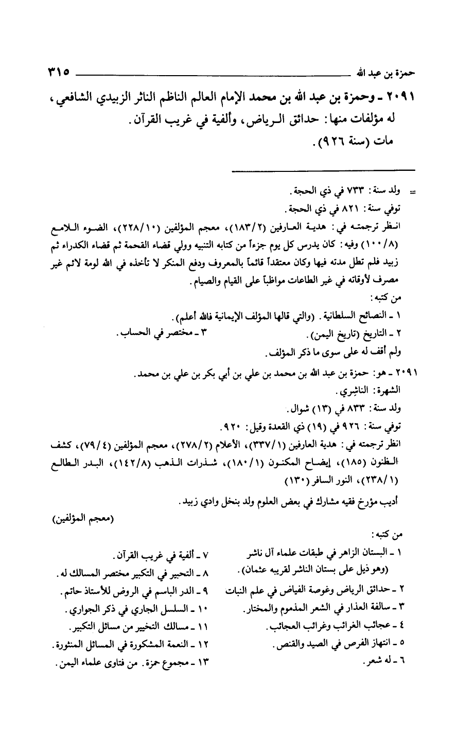 وحمزة بن عبد الله بن محمد الإمام العالم الناظم الناثر الزبيدي الشافعي، له مؤلفات منها: حدائق الرياض، وألفية في غريب القرآن.