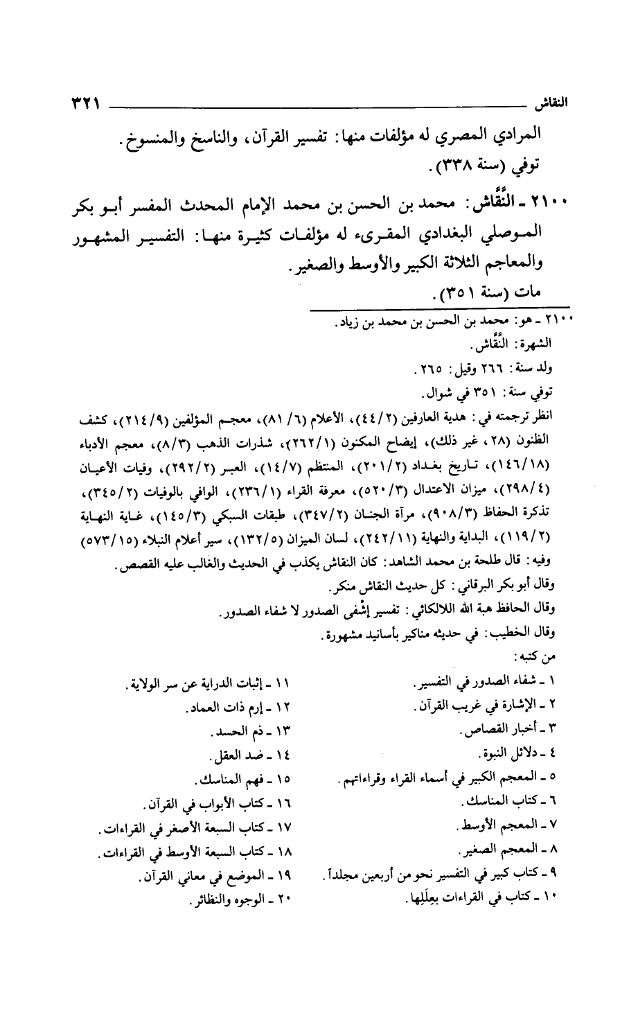 النقاش: محمد بن الحسن بن محمد الإمام المحدث المفسر أبو بكر الموصلي البغدادي المقرئ له مؤلفات كثيرة منها: التفسير المشهور والمعاجم الثلاثة الكبير والأوسط والصغير.