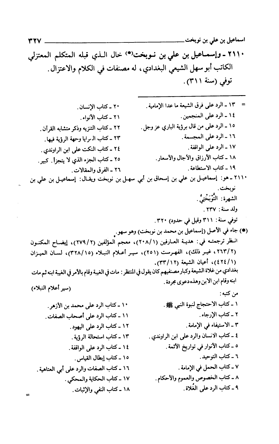 وإسماعيل بن علي بن نوبخت خال الذي قبله المتكلم المعتزلي الكاتب أبو سهل الشيعي البغدادي، له مصنفات في الكلام والاعتزال.