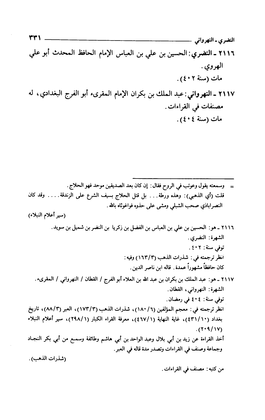 النهرواني: عبد الملك بن بكران الإمام المقرئ أبو الفرج الغدادي، له مصنفات في القراءات.