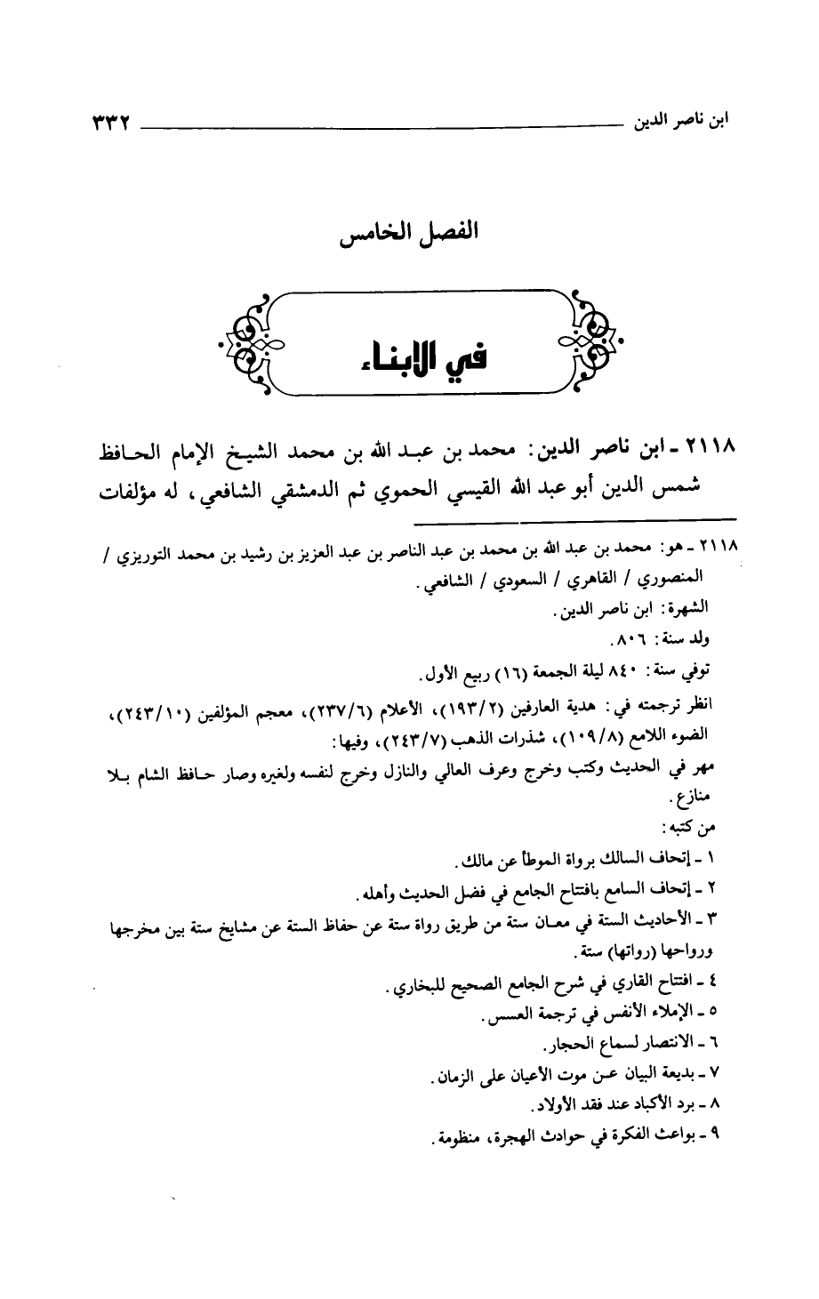 ابن ناصر الدين: محمد بن عبد الله بن محمد الشيخ الإمام الحافظ شمس الدين أبو عبد الله القيسي الحموي ثم الدمشقي الشافعي، له مؤلفات