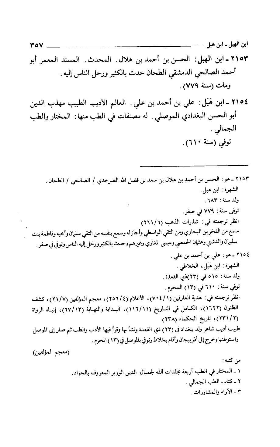 ابن هبل: علي بن أحمد بن علي. العالم الأديب الطبيب مهذب الدين أبو الحسن البغدادي الموصلي. له مصنفات في الطب منها: المختار والطب الجمالي.