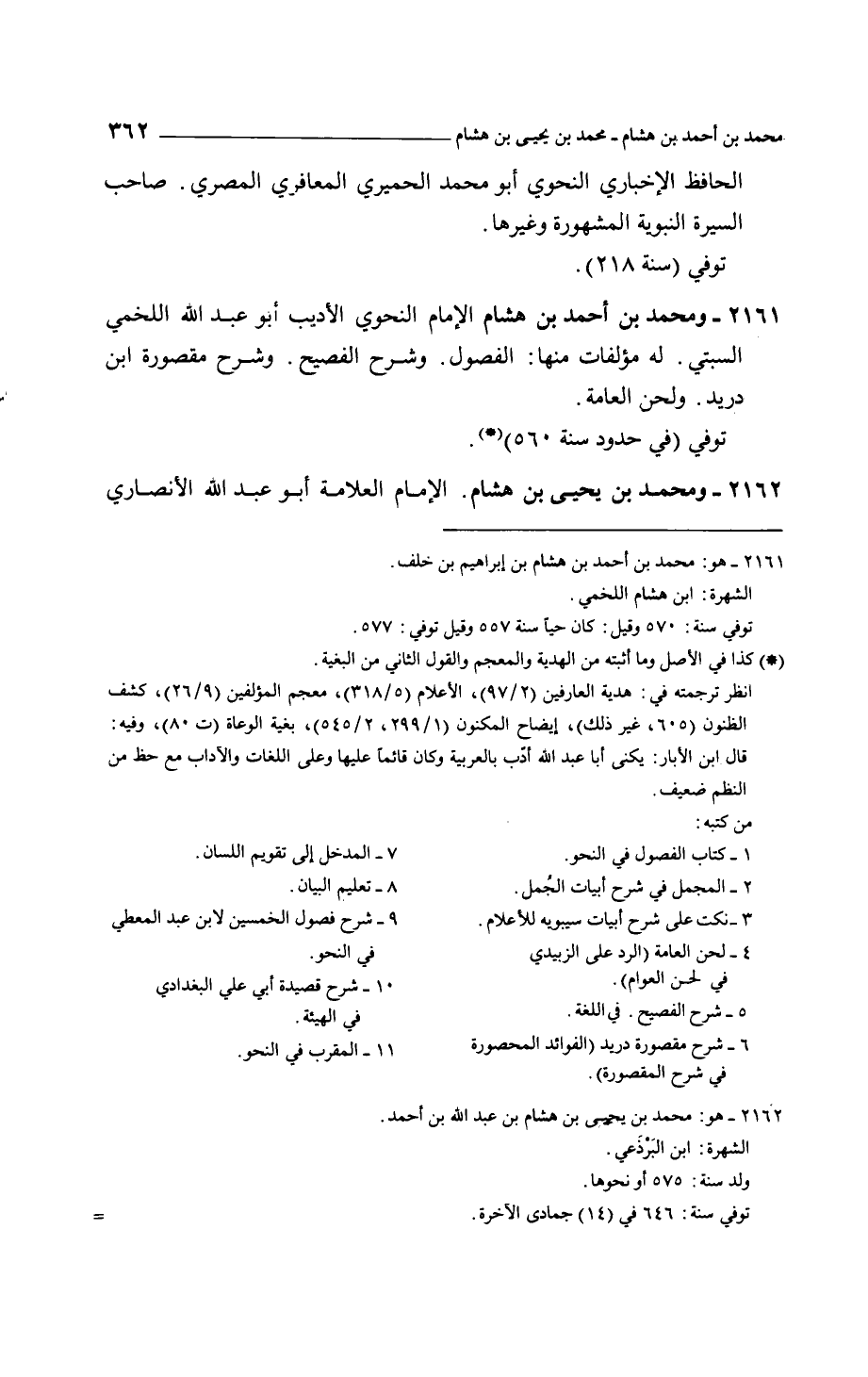 ومحمد بن أحمد بن هشام الإمام النحوي الأديب أبو عبد الله اللخمي السبتي. له مؤلفات منها: الفصول. الفصيح. وشرح مقصورة ابن دريد. ولحن العامة.