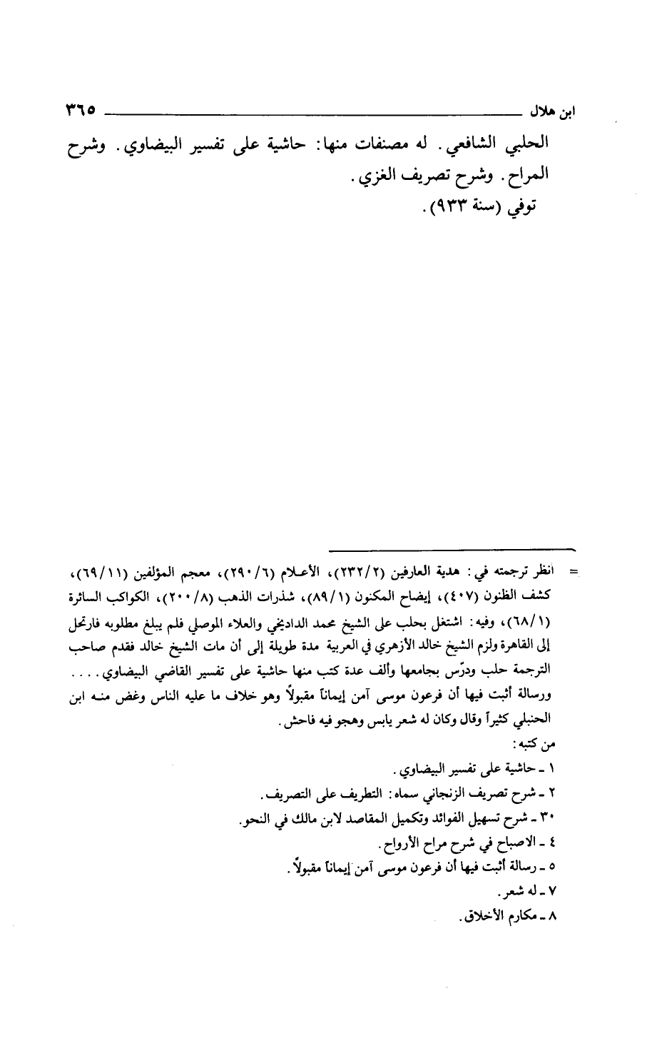 الحلبي الشافعي. له مصنفات منها: حاشية على تفسير البيضاوي. وشرح المراح. وشرح تصريف الغزي.