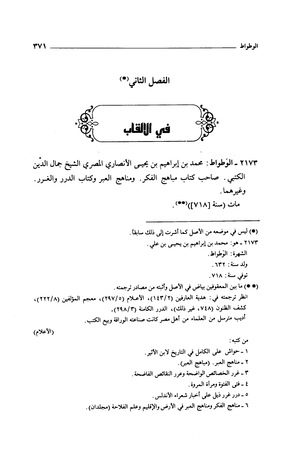 الوطواط: محمد بن إبراهيم بن يحيى الأنصاري المصري الشيخ جمال الدين الكتبي. صاحب كتاب مباهج الفكر. ومناهج العبر وكتاب الدرر والغرر. وغيرهما.