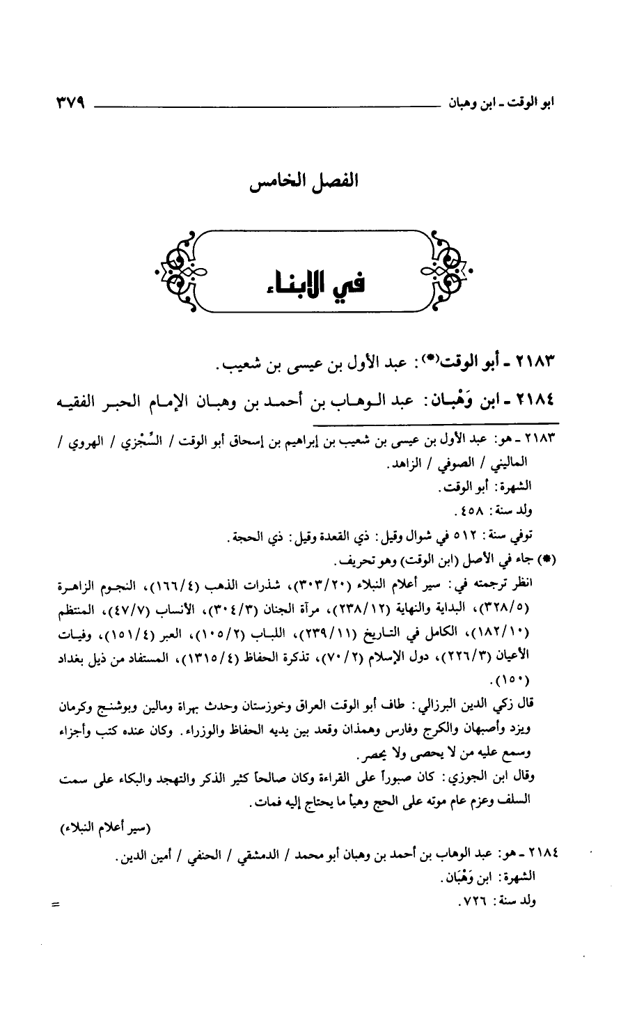 أبو الوقت: عبد الأول بن عيسى بن شعيب ابن وهبان: عبد الوهاب بن أحمد بن وهبان الإمام الحبر الفقيه