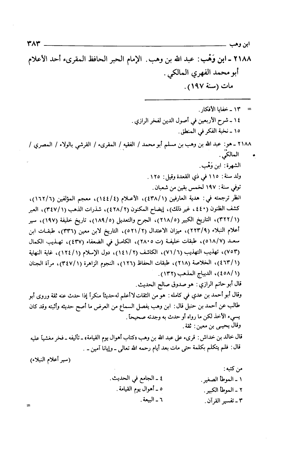ابن وهب: عبد الله بن وهب. الإمام الحبر الحافظ المقرئ أحد الأعلام أبو محمد الفهري المالكي.