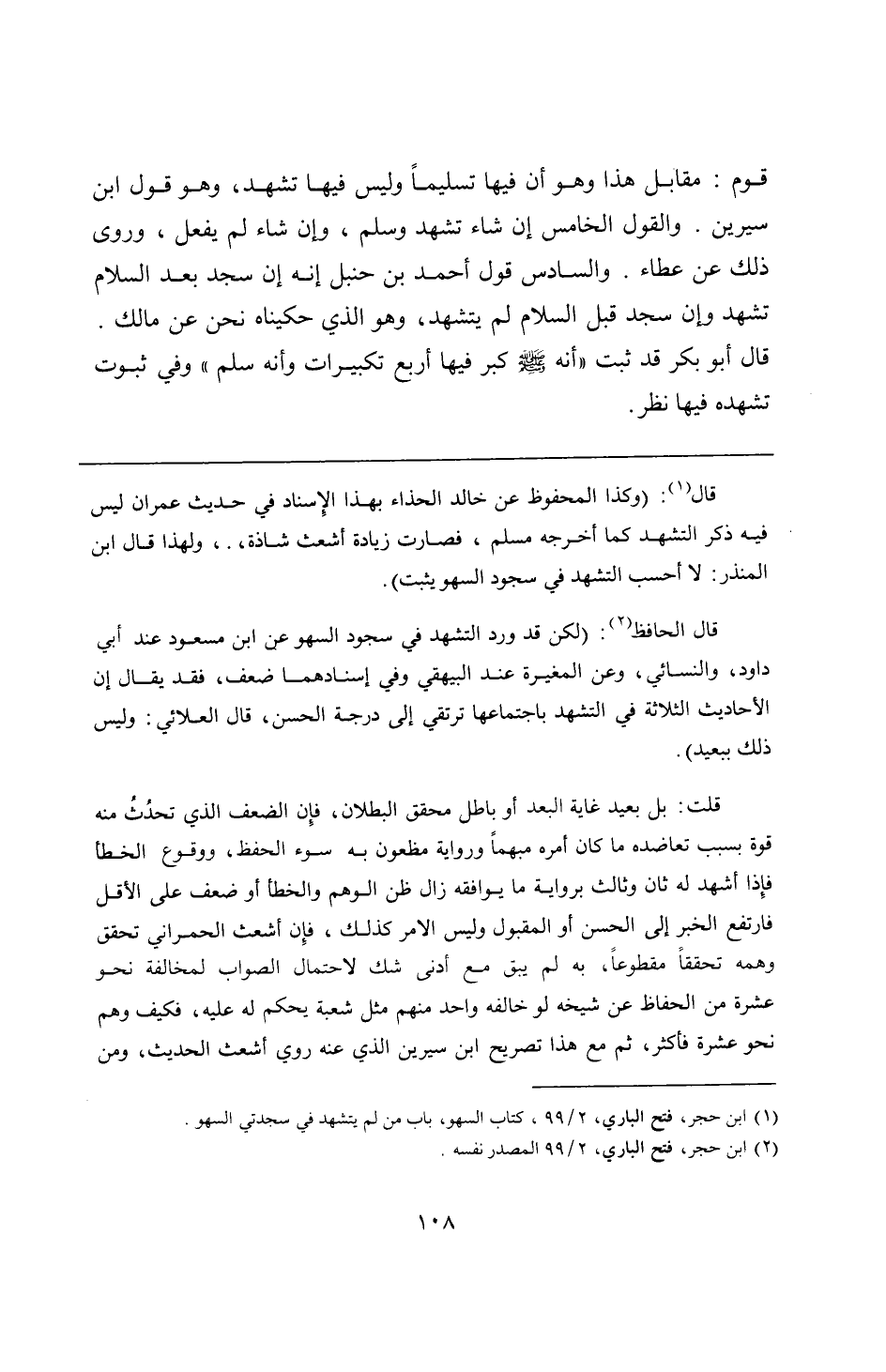 قال: (وكذا المحفوظ عن خالد الحذاء بهذا الإِسناد في حديث عمران ليس فيه ذكر التشهد كما أخرجه مسلم، فصارت زيادة أشعث شاذة،.، ولهذا قال ابن المنذر: لا أحسب التشهد في سجود السهو يثبت).