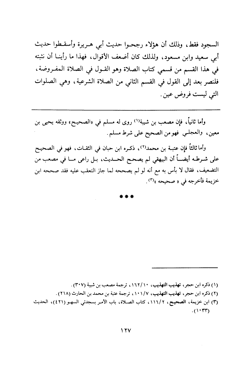 وأما ثالثًا فإِن عتبة بن محمد، ذكره ابن حبان في الثقات، فهو في الصحيح على شرطه أيضًا أن البيهقي لم يصحح الحديث، بل راعى ما في مصعب من التضعيف، فقال لا بأس به مع أنه لو لم يصححه لما جاز التعقب عليه فقد صححه ابن خزيمة فأخرجه في "صحيحه".