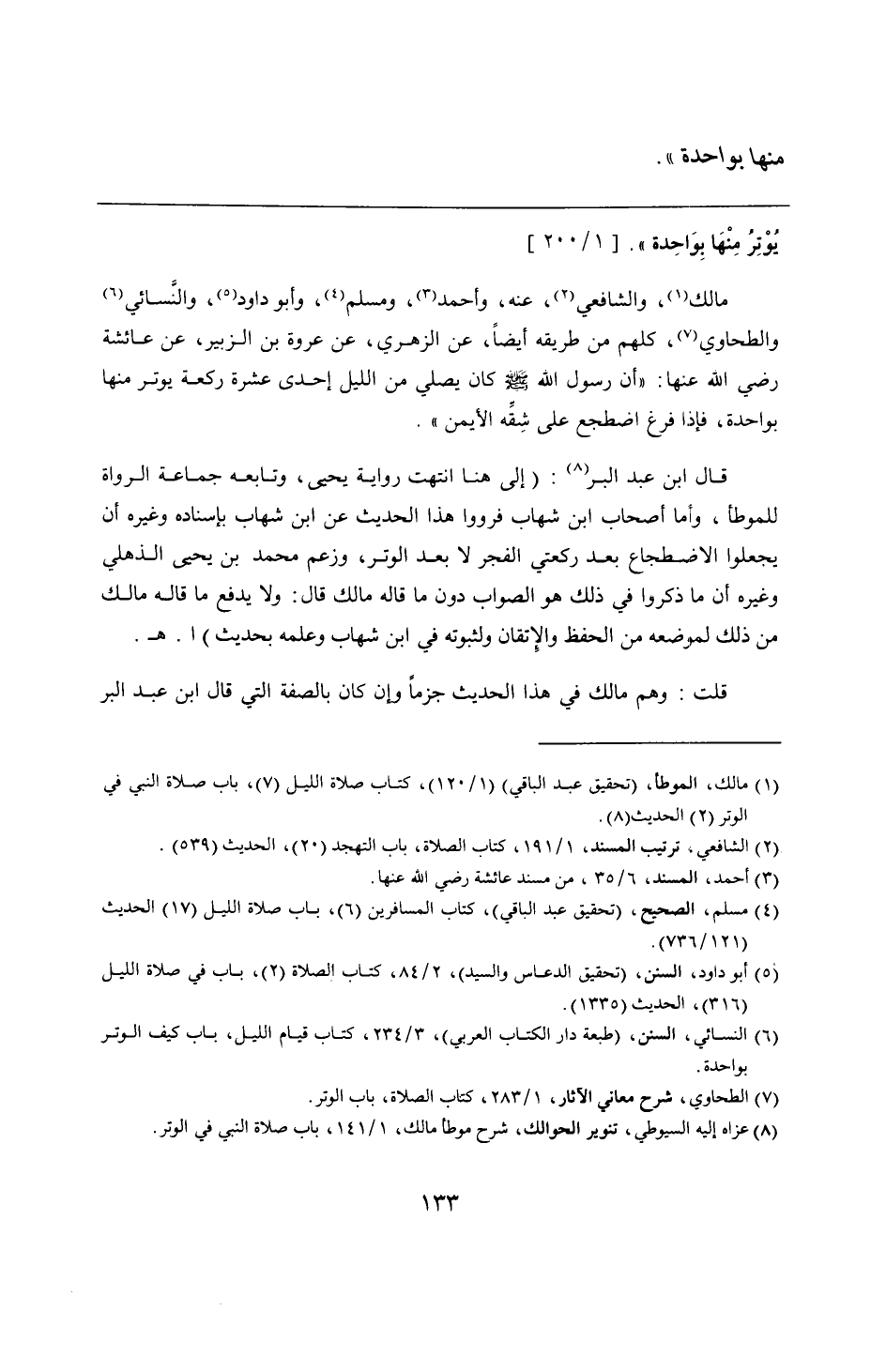 قال ابن عبد البر: (إلى هنا انتهت رواية يحيى، وتابعه جماعة الرواة للموطأ، وأما أصحاب ابن شهاب فرووا هذا الحديث عن ابن شهاب بإسناده وغيره أن يجعلوا الاضطجاع بعد ركعتي الفجر لا بعد الوتر، وزعم محمد بن يحيى الذهلي وغيره أن ما ذكروا في ذلك هو الصواب دون ما قاله مالك قال: ولا يدفع ما قاله مالك من ذلك لموضعه من الحفظ والإِتقان ولثبوته في ابن شهاب وعلمه بحديث) ا. هـ.