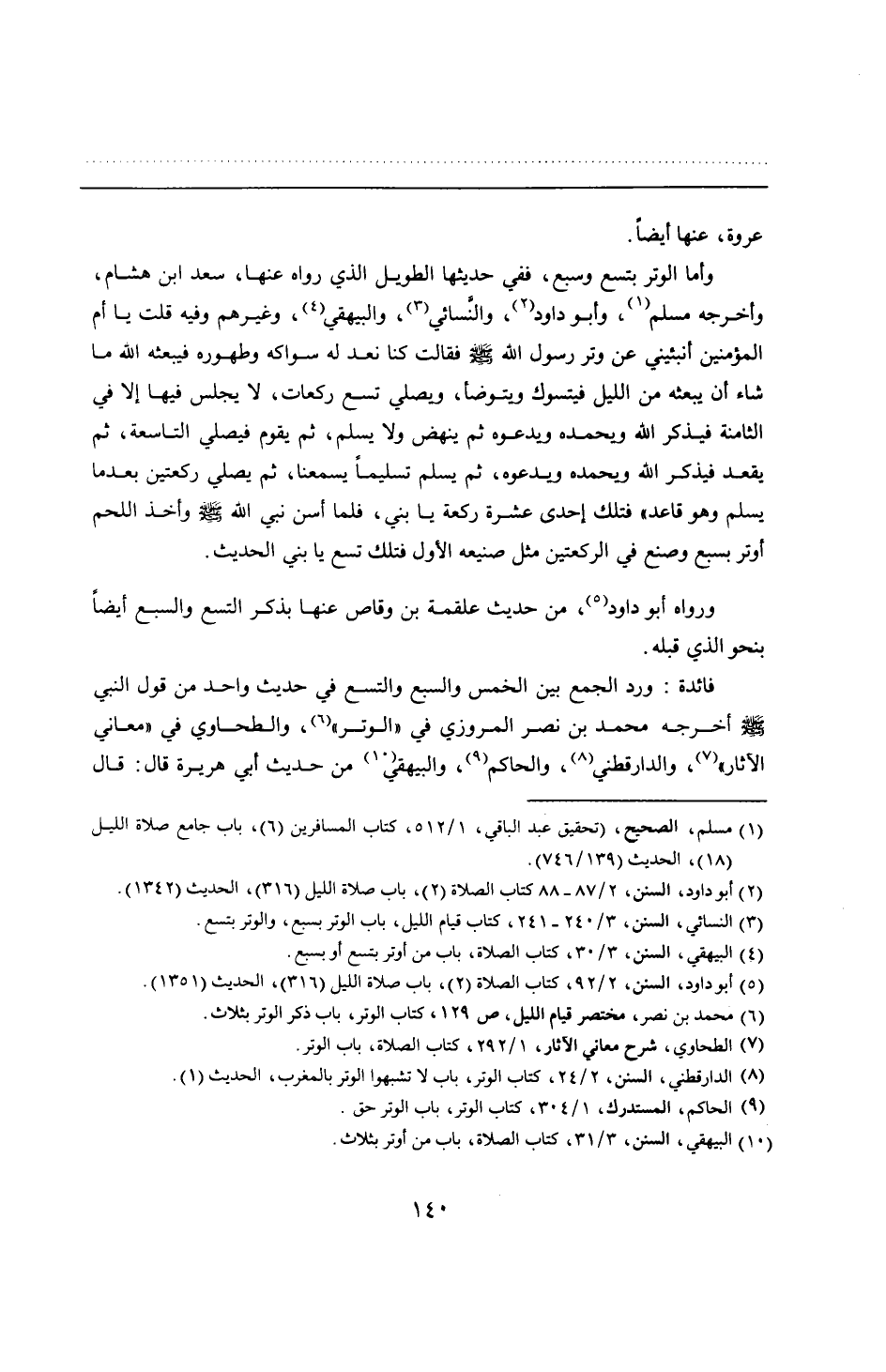 وأما الوتر بتسع وسبع، ففي حديثها الطويل الذي رواه عنها، سعد ابن هشام، وأخرجه مسلم، وأبو داود، والنَّسائي، والبيهقي، وغيرهم وفيه قلت يا أم المؤمنين أنبئيني عن وتر رسول الله - صلى الله عليه وسلم - فقالت كنا نعد له سواكه وطهوره فيبعثه الله ما شاء أن يبعثه من الليل فيتسوك ويتوضأ، ويصلي تسع ركعات، لا يجلس فيها إلا في الثامنة فيذكر الله ويحمده ويدعوه ثم ينهض ولا يسلم، ثم يقوم فيصلي التاسعة، ثم يقعد فيذكر الله ويحمده ويدعوه، ثم يسلم تسليمًا يسمعنا، ثم يصلي ركعتين بعدما يسلم وهو قاعد" فتلك إحدى عشرة ركعة يا بني، فلما أسن نبي الله - صلى الله عليه وسلم - وأخذ اللحم أوتر بسبع وصنع في الركعتين مثل صنيعه الأول فتلك تسع يا بني الحديث.
