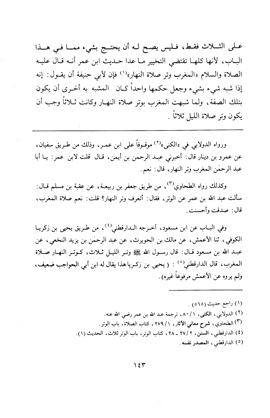 وكذلك رواه الطحاوي، من طريق جعفر بن ربيعة، عن عقبة بن مسلم قال: سألت عبد الله بن عمر عن الوتر، فقال: أتعرف وتر النهار؟ قلت: نعم صلاة المغرب، قال: صدقت وأحسنت.