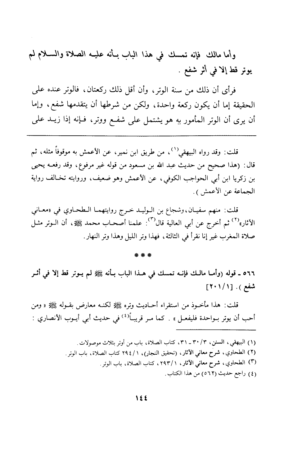 566 - قوله (وأما مالك فإنه تمسك في هذا الباب بأنه - صلى الله عليه وسلم - لم يوتر قط إلا في أثر شفع).