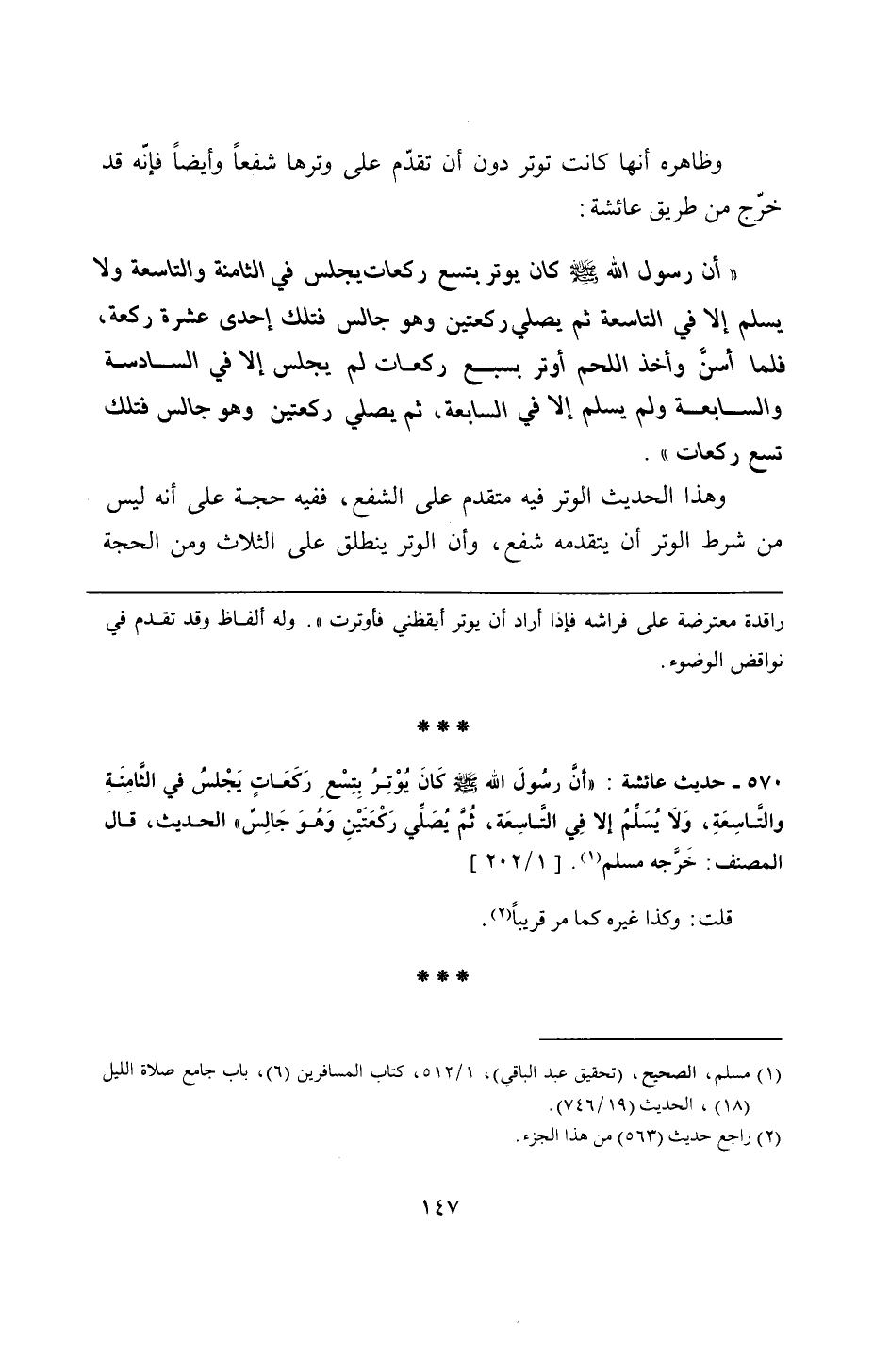 570 - حديث عائشة: "أنَّ رسُولَ الله - صلى الله عليه وسلم - كَانَ يُوْتِرُ بِتِسْعِ رَكعَاتٍ يَجْلسُ في الثَّامِنَةِ والتَّاسِعَةِ، وَلَا يُسَلِّمُ إلا فِي التَّاسِعَة، ثُمَّ يُصَلِّي رَكْعَتَيْنِ وَهُوَ جَالِسٌ" الحديث، قال المصنف: خَرَّجه مسلم.