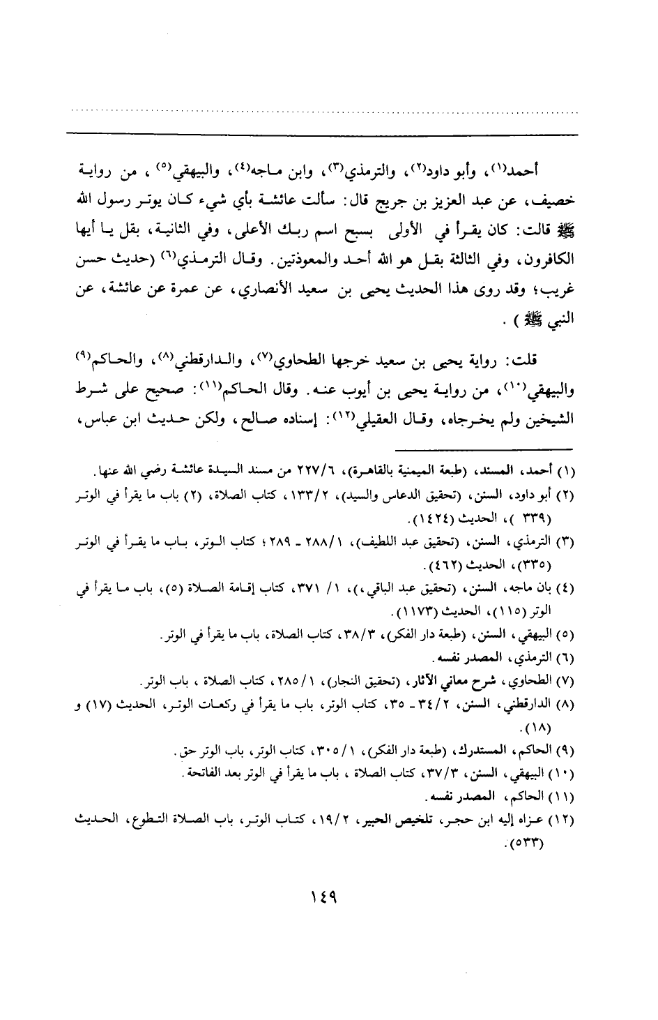 أحمد، وأبو داود، والترمذي، وابن ماجه، والبيهقي، من رواية خصيف، عن عبد العزيز بن جريج قال: سألت عائشة بأي شيء كان يوتر رسول الله - صلى الله عليه وسلم - قالت: كان يقرأ في الأولى بسبح اسم ربك الأعلى، وفي الثانية، بقل يا أيها الكافرون، وفي الثالثة بقل هو الله أحد والمعوذتين. وقال الترمذي (حديث حسن غريب؛ وقد روى هذا الحديث يحيى بن سعيد الأنصاري، عن عمرة عن عائشة، عن النبي - صلى الله عليه وسلم -).
