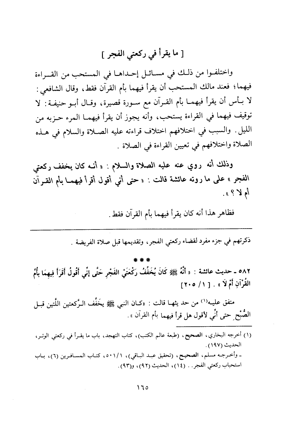582 - حديث عائشة: "أنَّهُ - صلى الله عليه وسلم - كَانَ يُخَفِّفُ رَكْعَتَيْ الفَجْرِ حَتَّي إنَّي أَقُولُ أَقَرَأَ فِيهِمَا باُمِّ القُرْآنِ أَمْ لَا".