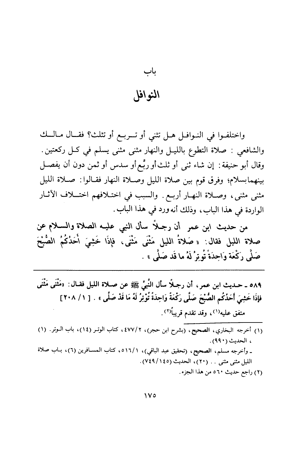 589 - حديث ابن عمر، أن رجلًا سأل النبي - صلى الله عليه وسلم - عن صلاة الليل فقال: "مَثْنَى مَثْنَى فإذَا خَشِيَ أحَدُكُم الصُّبْحَ صَلَّى رَكْعَةً وَاحِدَةً تُوْتِرُ لَهُ مَا قَدْ صَلَّي".