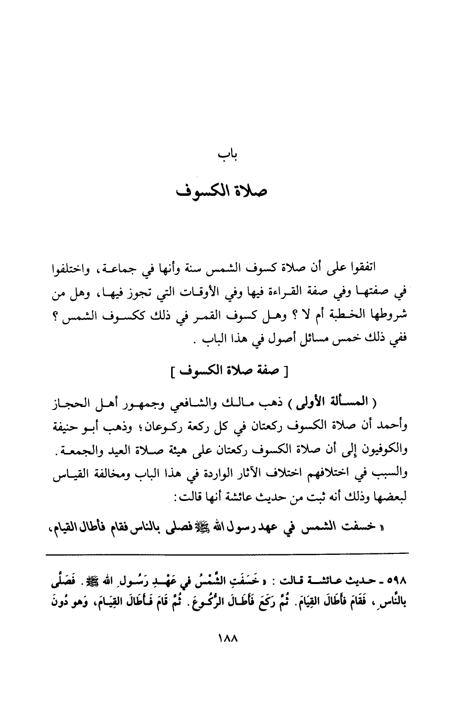 598 - حديث عائشة قالت: "خَسَفَتِ الشَّمْسُ في عَهْدِ رَسُولِ الله - صلى الله عليه وسلم -. فَصلَّى