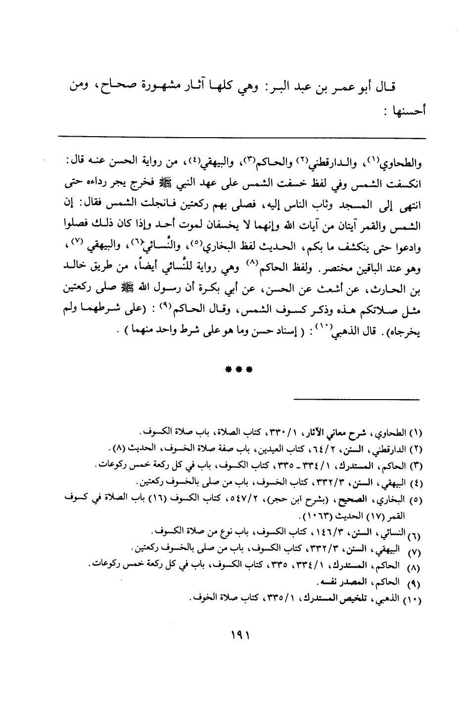 والطحاوي، والدارقطني والحاكم، والبيهقي، من رواية الحسن عنه قال: انكسفت الشمس وفي لفظ خسفت الشمس على عهد النبي - صلى الله عليه وسلم - فخرج يجر رداءه حتى انتهى إلى المسجد وثاب الناس إليه، فصلى بهم ركعتين فانجلت الشمس فقال: إن الشمس والقمر آيتان من آيات الله وإنهما لا يخسفان لموت أحد وإذا كان ذلك فصلوا وادعوا حتى ينكشف ما بكم، الحديث لفظ البخاري، والنَّسائي، والبيهقي، وهو عند الباقين مختصر. ولفظ الحاكم وهي رواية للنَّسائي أيضًا، من طريق خالد بن الحارث، عن أشعث عن الحسن، عن أبي بكرة أن رسول الله - صلى الله عليه وسلم - صلى ركعتين مثل صلاتكم هذه وذكر كسوف الشمس، وقال الحاكم: (على شرطهما ولم يخرجاه). قال الذهبي: (إسناد حسن وما هو على شرط واحد منهما).