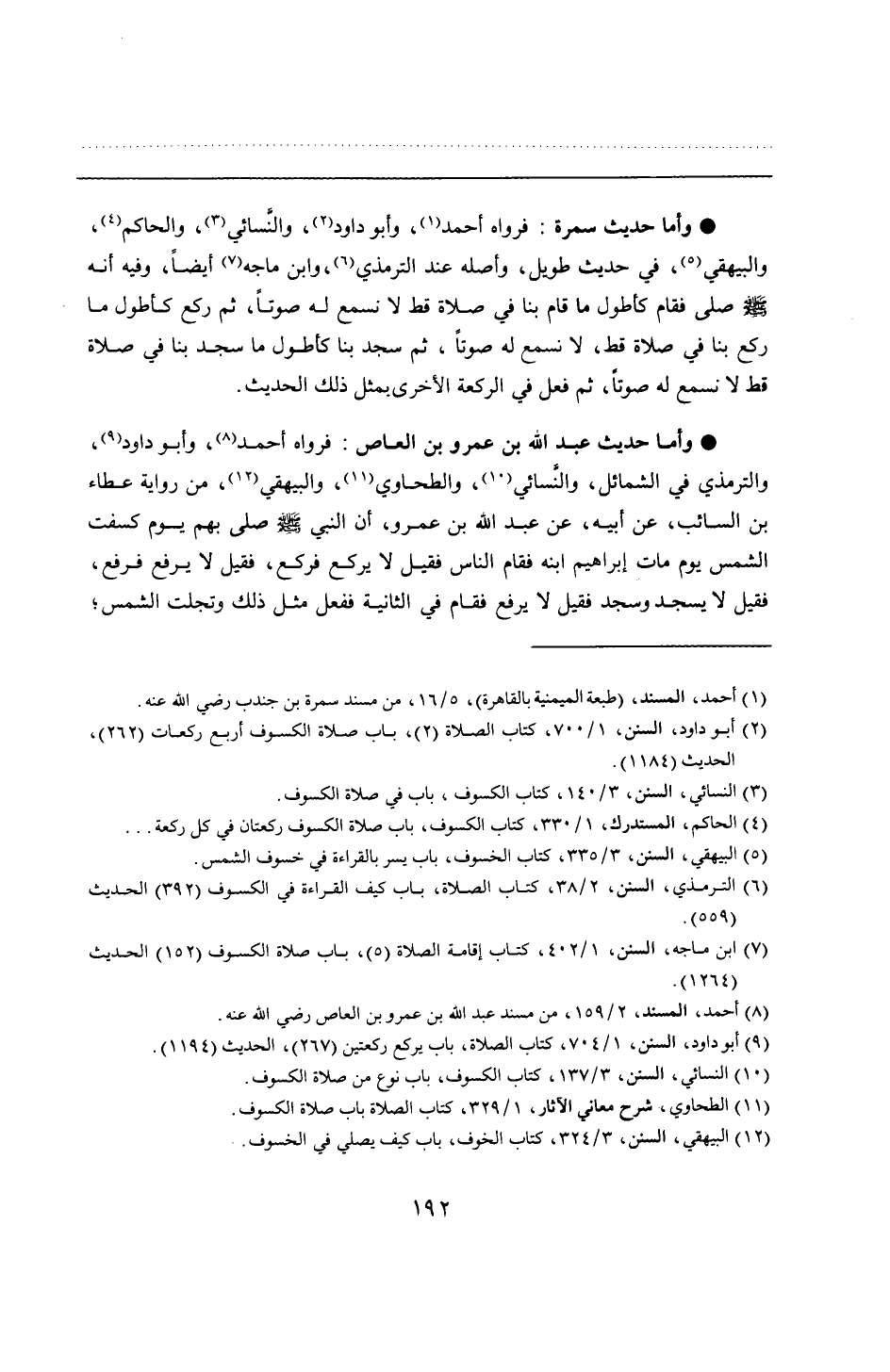 • وأما حديث عبد الله بن عمرو بن العاص: فرواه أحمد، وأبو داود، والترمذي في الشمائل، والنَّسائي، والطحاوي، والبيهقي، من رواية عطاء بن السائب، عن أبيه، عن عبد الله بن عمرو، أن النبي - صلى الله عليه وسلم - صلى بهم يوم كسفت الشمس يوم مات إبراهيم ابنه فقام الناس فقيل لا يركع فركع، فقيل لا يرفع فرفع، فقيل لا يسجد وسجد فقيل لا يرفع فقام في الثانية ففعل مثل ذلك وتجلت الشمس؛