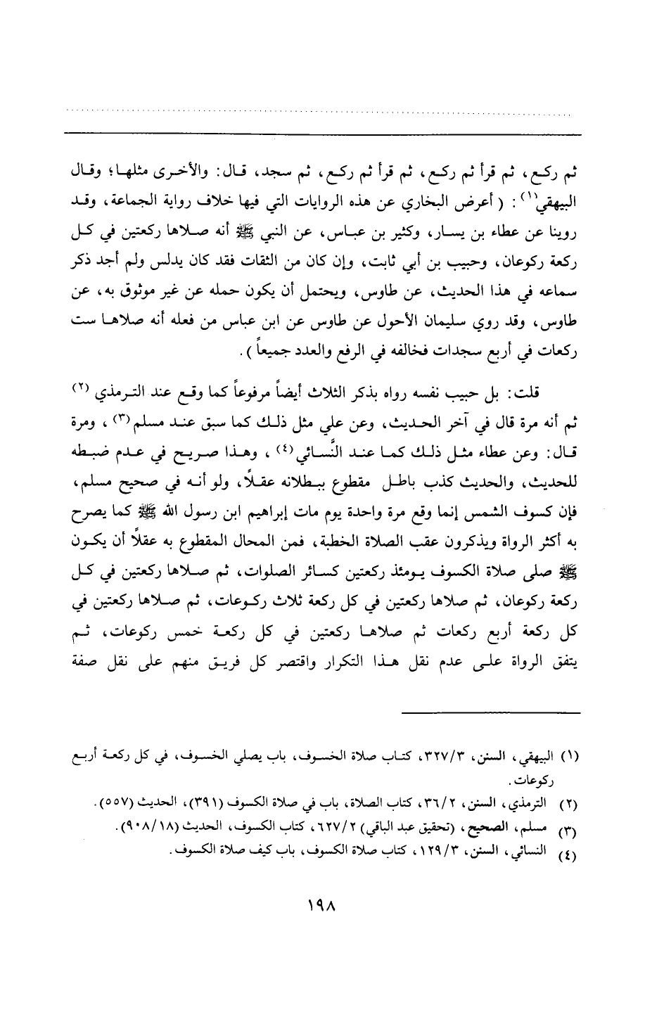 ثم ركع، ثم قرأ ثم ركع، ثم قرأ ثم ركع، ثم سجد، قال: والأخرى مثلها؛ وقال البيهقي: (أعرض البخاري عن هذه الروايات التي فيها خلاف رواية الجماعة، وقد روينا عن عطاء بن يسار، وكثير بن عباس، عن النبي - صلى الله عليه وسلم - أنه صلاها ركعتين في كل ركعة ركوعان، وحبيب بن أبي ثابت، وإن كان من الثقات فقد كان يدلس ولم أجد ذكر سماعه في هذا الحديث، عن طاوس، ويحتمل أن يكون حمله عن غير موثوق به، عن طاوس، وقد روي سليمان الأحول عن طاوس عن ابن عباس من فعله أنه صلاها ست ركعات في أربع سجدات فخالفه في الرفع والعدد جميعًا).