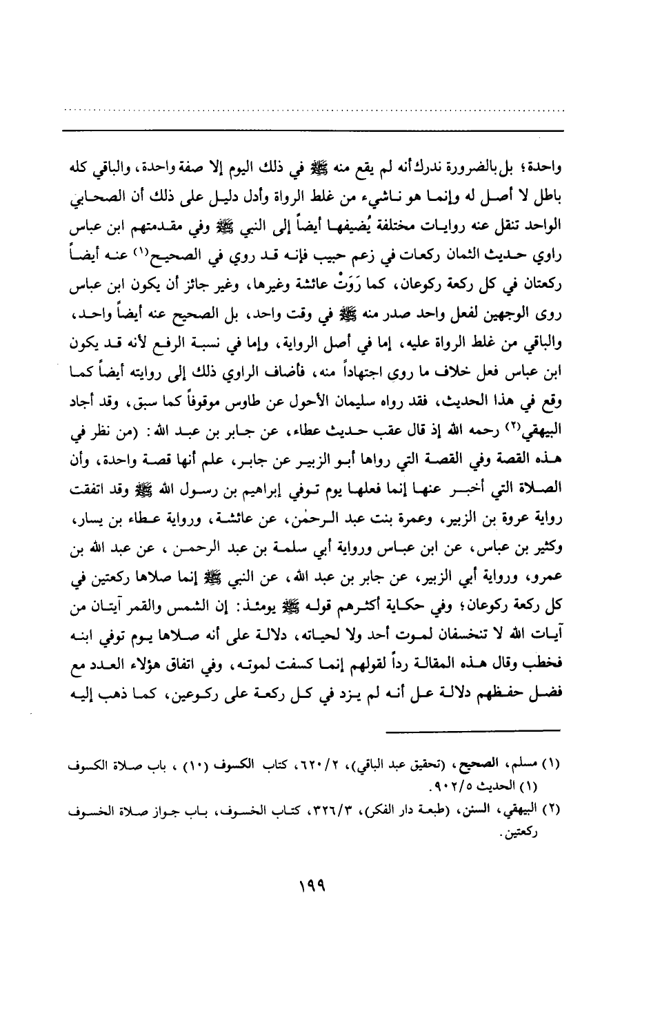 واحدة؛ بل بالضرورة ندرك أنه لم يقع منه - صلى الله عليه وسلم - في ذلك اليوم إلا صفة واحدة، والباقي كله باطل لا أصل له وإنما هو ناشيء من غلط الرواة وأدل دليل على ذلك أن الصحابي الواحد تنقل عنه روايات مختلفة يُضيفها أيضًا إلى النبي - صلى الله عليه وسلم - وفي مقدمتهم ابن عباس راوي حديث الثمان ركعات في زعم حبيب فإنه قد روي في الصحيح عنه أيضًا ركعتان في كل ركعة ركوعان، كما رَوَتْ عائشة وغيرها، وغير جائز أن يكون ابن عباس روى الوجهين لفعل واحد صدر منه - صلى الله عليه وسلم - في وقت واحد، بل الصحيح عنه أيضًا واحد، والباقي من غلط الرواة عليه، إما في أصل الرواية، وإما في نسبة الرفع لأنه قد يكون ابن عباس فعل خلاف ما روى اجتهادًا منه، فأضاف الراوي ذلك إلى روايته أيضًا كما وقع في هذا الحديث، فقد رواه سليمان الأحول عن طاوس موقوفًا كما سبق، وقد أجاد البيهقي -رحمه الله- إذ قال عقب حديث عطاء، عن جابر بن عبد الله: (من نظر في هذه القصة وفي القصة التي رواها أبو الزبير عن جابر، علم أنها قصة واحدة، وأن الصلاة التي أخبر عنها إنما فعلها يوم توفي إبراهيم بن رسول الله - صلى الله عليه وسلم - وقد اتفقت رواية عروة بن الزبير، وعمرة بنت عبد الرحمن، عن عائشة، ورواية عطاء بن يسار، وكثير بن عباس، عن ابن عباس ورواية أبي سلمة بن عبد الرحمن، عن عبد الله بن عمرو، ورواية أبي الزبير، عن جابر بن عبد الله، عن النبي - صلى الله عليه وسلم - إنما صلاها ركعتين في كل ركعة ركوعان؛ وفي حكاية أكثرهم قوله - صلى الله عليه وسلم - يومئذ: إن الشمس والقمر آيتان من آيات الله لا تنخسفان لموت أحد ولا لحياته، دلالة على أنه صلاها يوم توفي ابنه فخطب وقال هذه المقالة ردًا لقولهم إنما كسفت لموته، وفي اتفاق هؤلاء العدد مع فضل حفظهم دلالة على أنه لم يزد في كل ركعة على ركوعين، كما ذهب إليه