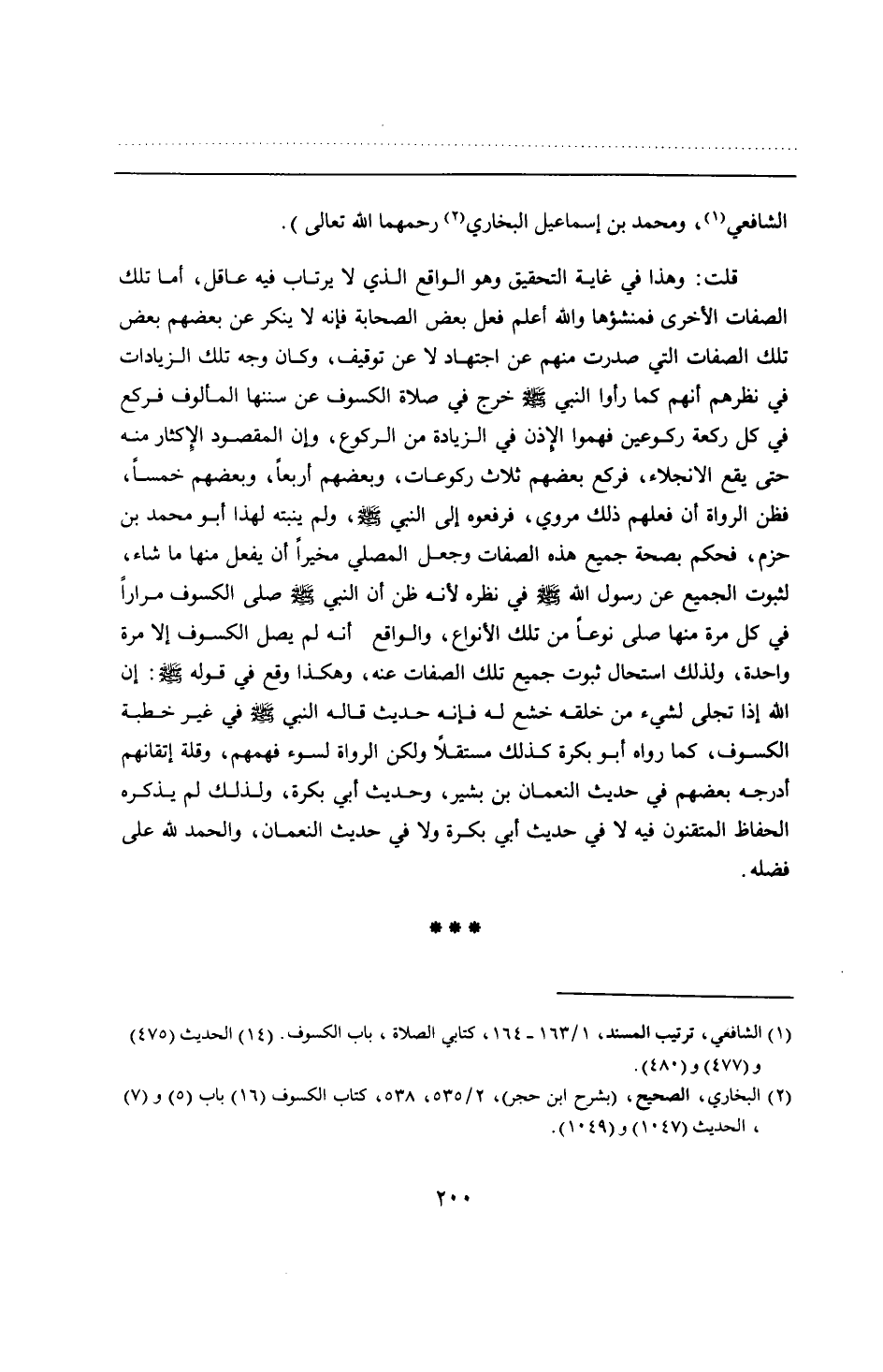 قلت: وهذا في غاية التحقيق وهو الواقع الذي لا يرتاب فيه عاقل، أما تلك الصفات الأخرى فمنشؤها والله أعلم فعل بعض الصحابة فإنه لا ينكر عن بعضهم بعض تلك الصفات التي صدرت منهم عن اجتهاد لا عن توقيف، وكان وجه تلك الزيادات في نظرهم أنهم كما رأوا النبي - صلى الله عليه وسلم - خرج في صلاة الكسوف عن سننها المألوف فركع في كل ركعة ركوعين فهموا الإذن في الزيادة من الركوع، وإن المقصود الإِكثار منه حتى يقع الانجلاء، فركع بعضهم ثلاث ركوعات، وبعضهم أربعًا، وبعضهم خمسًا، فظن الرواة أن فعلهم ذلك مروي، فرفعوه إلى النبي - صلى الله عليه وسلم -، ولم ينتبه لهذا أبو محمد بن حزم، فحكم بصحة جميع هذه الصفات وجعل المصلي مخيرًا أن يفعل منها ما شاء، لثبوت الجميع عن رسول الله - صلى الله عليه وسلم - في نظره لأنه ظن أن النبي - صلى الله عليه وسلم - صلى الكسوف مرارًا في كل مرة منها صلى نوعًا من تلك الأنواع، والواقع أنه لم يصل الكسوف إلا مرة واحدة، ولذلك استحال ثبوت جميع تلك الصفات عنه، وهكذا وقع في قوله - صلى الله عليه وسلم -: إن الله إذا تجلى لشيء من خلقه خشع له فإنه حديث قاله النبي - صلى الله عليه وسلم - في غير خطبة الكسوف، كما رواه أبو بكرة كذلك مستقلًا ولكن الرواة لسوء فهمهم، وقلة إتقانهم أدرجه بعضهم في حديث النعمان بن بشير، وحديث أبي بكرة، ولذلك لم يذكره الحفاظ المتقنون فيه لا في حديث أبي بكرة ولا في حديث النعمان، والحمد لله على فضله.