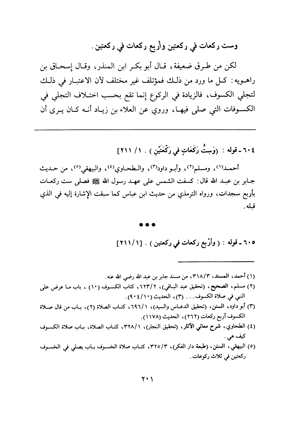 أحمد، ومسلم، وأبو داود، والطحاوي، والبيهقي، من حديث جابر بن عبد الله قال: كسفت الشمس على عهد رسول الله - صلى الله عليه وسلم - فصلى ست ركعات بأربع سجدات، ورواه الترمذي من حديث ابن عباس كما سبقت الإشارة إليه في الذي قبله.