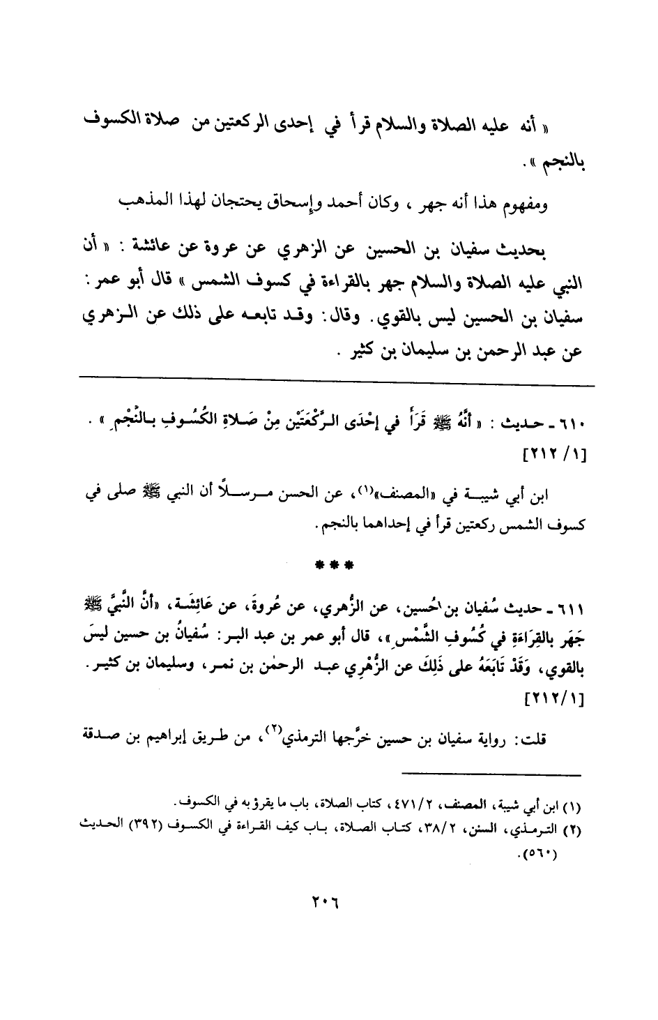 611 - حديث سُفيان بن حُسين، عن الزُّهري، عن عُروةَ، عن عَائِشَة، "أنَّ النَّبيَّ - صلى الله عليه وسلم - جَهَر بالقِرَاءَةِ في كُسُوفِ الشَّمْسِ"، قال أبو عمر بن عبد البر: سُفيانُ بن حسين ليسَ بالقوي، وَقَدْ تَابَعَهُ على ذَلِكَ عن الزُّهْرِي عبد الرحمن بن نمر، وسليمان بن كثير.