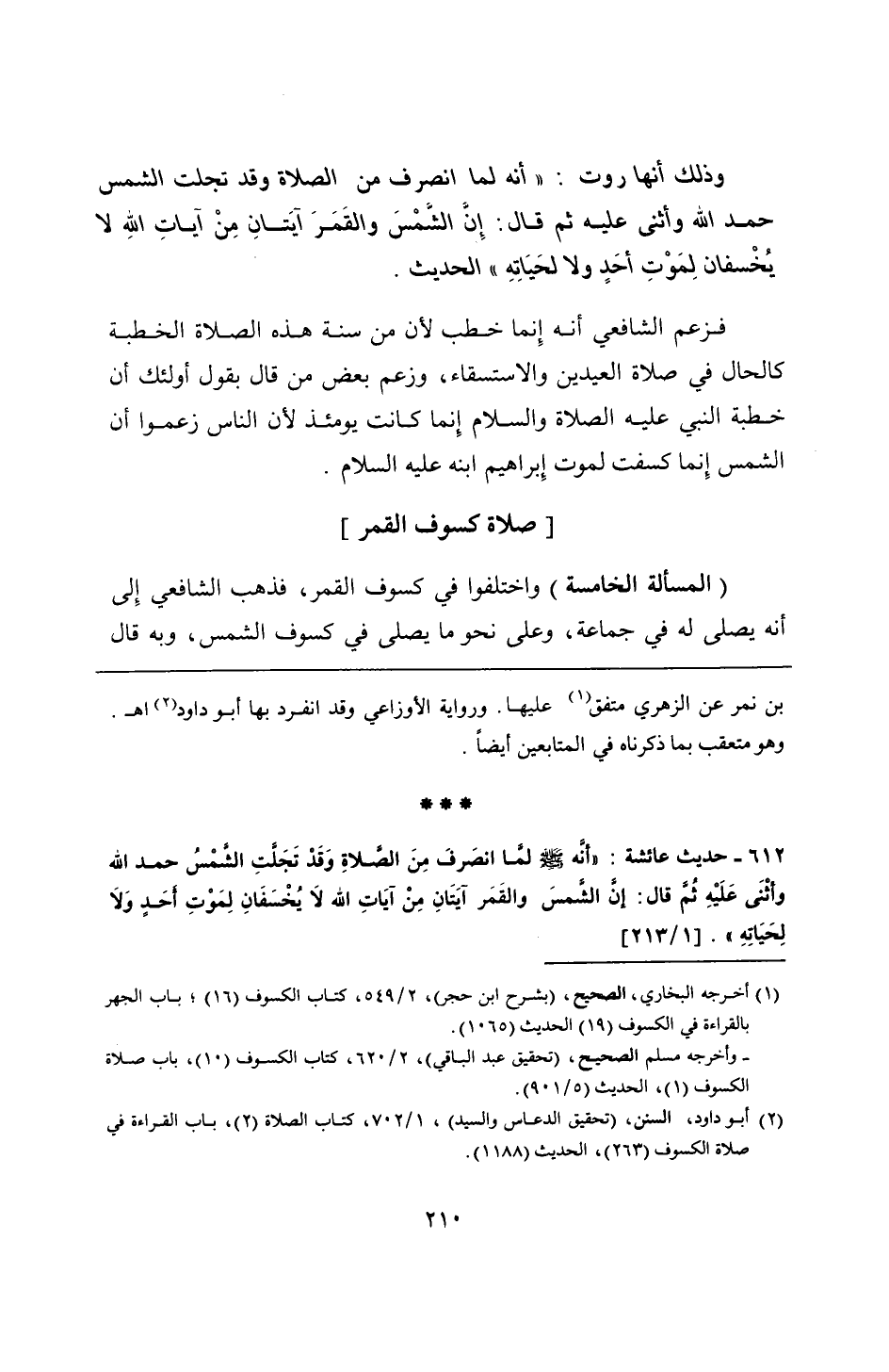 612 - حديث عائشة: "أنَّه - صلى الله عليه وسلم - لمَّا انصَرفَ مِنَ الصَّلاةِ وَقَدْ تَجَلَّتِ الشَّمْسُ حمد الله وأثْنَى عَلَيْهِ ثُمَّ قال: إنَّ الشَّمسَ والقَمَر آيَتَانِ مِنْ آيَاتِ الله لَا يُخْسَفَانِ لِمَوْتِ أحَدٍ وَلَا لِحَيَاتِهِ".