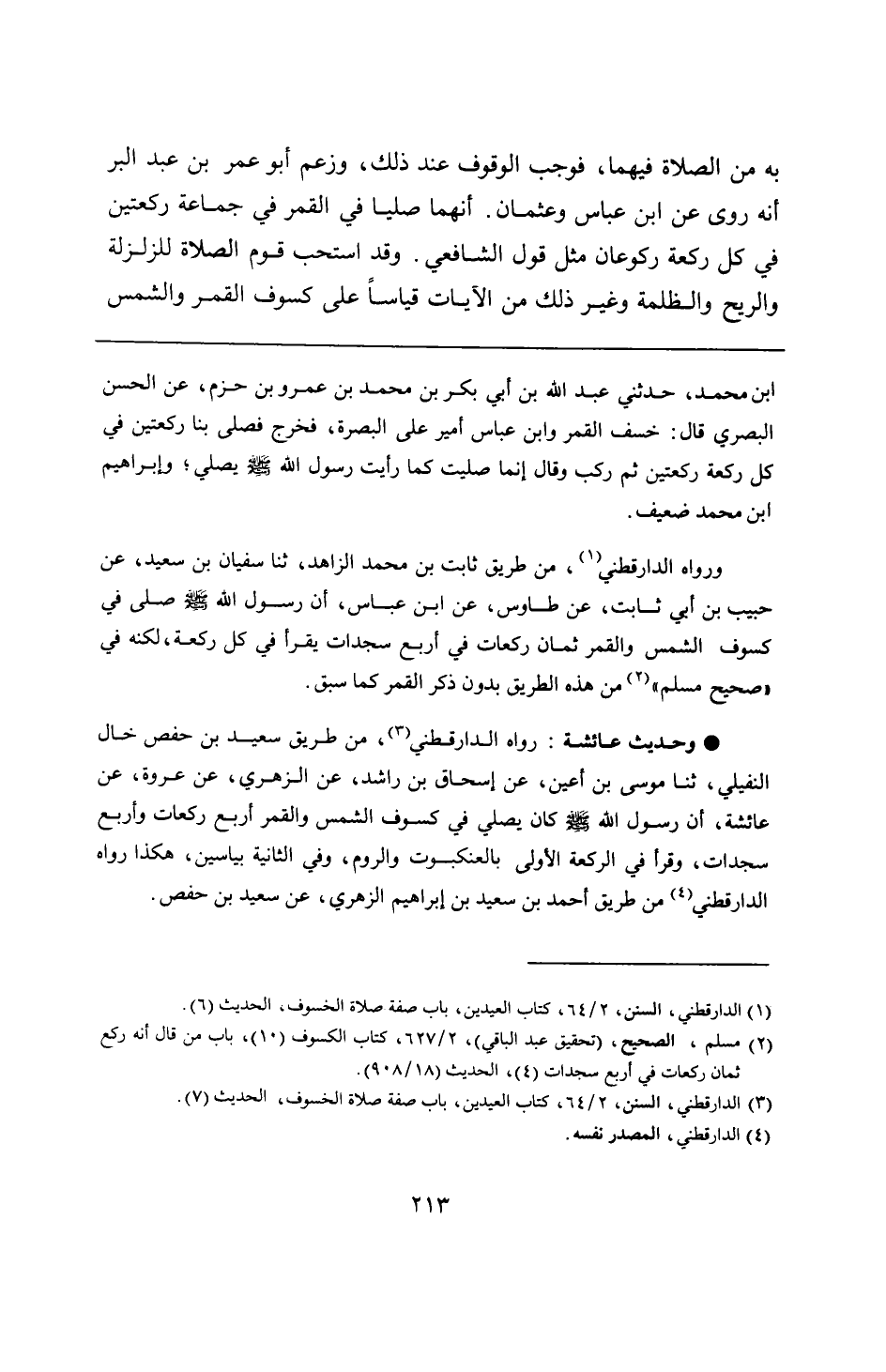 ورواه الدارقطني، من طريق ثابت بن محمد الزاهد، ثنا سفيان بن سعيد، عن حبيب بن أبي ثابت، عن طاوس، عن ابن عباس، أن رسول الله - صلى الله عليه وسلم - صلى في كسوف الشمس والقمر ثمان ركعات في أربع سجدات يقرأ في كل ركعة، لكنه في "صحيح مسلم" من هذه الطريق بدون ذكر القمر كما سبق.
