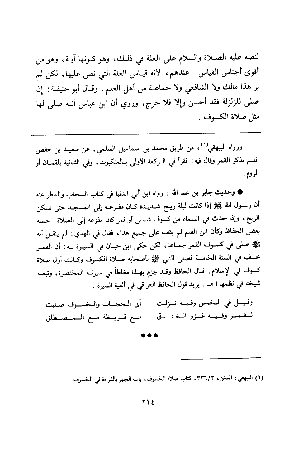 • وحديث جابر بن عبد الله: رواه ابن أبي الدنيا في كتاب السحاب والمطر عنه أن رسول الله - صلى الله عليه وسلم - إذا كانت ليلة ريح شديدة كان مفزعه إلى المسجد حتى تسكن الريح، وإذا حدث في السماء من كسوف شمس أو قمر كان مفزعه إلى الصلاة. حسنه بعض الحفاظ وكان ابن القيم لم يقف على جميع هذا، فقال في الهدي: لم ينقل أنه - صلى الله عليه وسلم - صلى في كسوف القمر جماعة، لكن حكى ابن حبان في السيرة له: أن القمر خسف في السنة الخامسة فصلى النبي - صلى الله عليه وسلم - بأصحابه صلاة الكسوف وكانت أول صلاة كسوف في الأسلام. قال الحافظ وقد جزم بهذا مغلطًا في سيرته المختصرة، وتبعه شيخنا في نظمها اهـ. يريد قول الحافظ العراقي في ألفية السيرة.