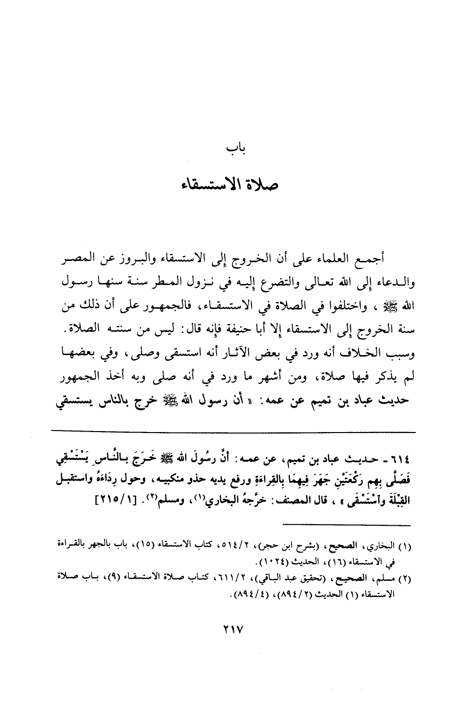 614 - حديث عباد بن تميم، عن عمه: أنَّ رسُولَ الله - صلى الله عليه وسلم - خَرَجَ بالنَّاسِ يَسْتَسْقِي فَصَلَّى بِهِمِ رَكْعَتَيْنِ جَهَرَ فِيهِمَا بِالقِراءَةِ ورفع يديه حذو منكبيه، وحول رِدَاءَهُ واستقبل القبَلَةَ واسْتسْقَى" قال المصنف: خرَّجهُ البخاري، ومسلم.