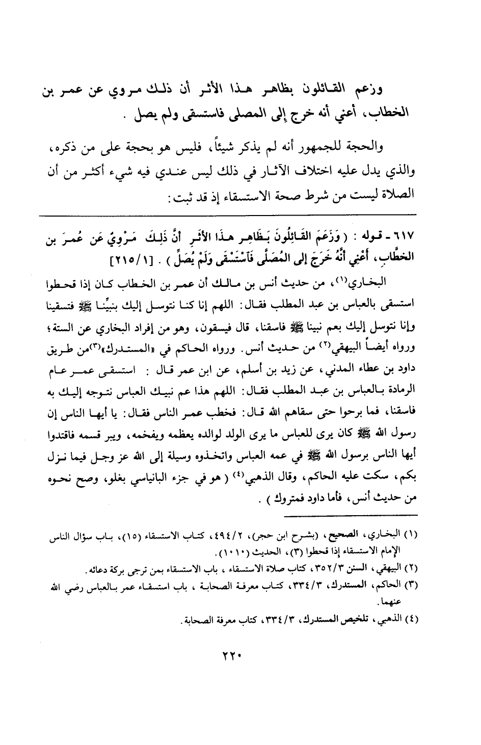 617 - قوله: (وَزَعَمَ القَائِلُونَ بَظَاهِر هذَا الأثَرِ أنَّ ذَلِكَ مَرْوِيٌ عَن عُمرَ بن الخطَّابِ، أَعْنِي أنَّهُ خَرَجَ إلى المُصَلَّى فَاسْتَسْقَى وَلَمْ يُصَلِّ).