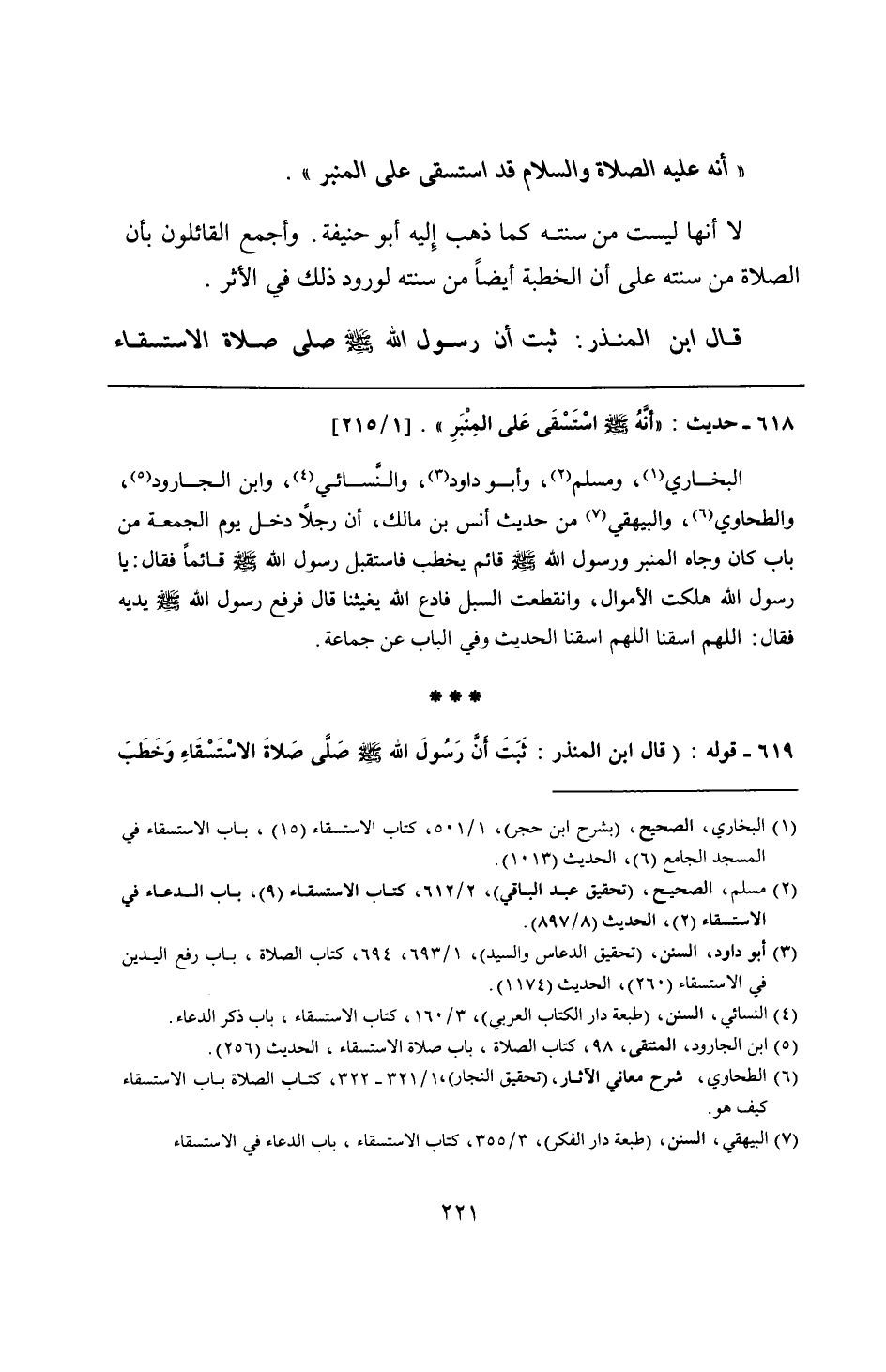 البخاري، ومسلم، وأبو داود، والنسائي، وابن الجارود، والطحاوي، والبيهقي من حديث أنس بن مالك، أن رجلًا دخل يوم الجمعة من باب كان وجاه المنبر ورسول الله - صلى الله عليه وسلم - قائم يخطب فاستقبل رسول الله - صلى الله عليه وسلم - قائمًا فقال: يا رسول الله هلكت الأموال، وانقطعت السبل فادع الله يغيثنا قال فرفع رسول الله - صلى الله عليه وسلم - يديه فقال: اللهم اسقنا اللهم اسقنا الحديث وفي الباب عن جماعة.