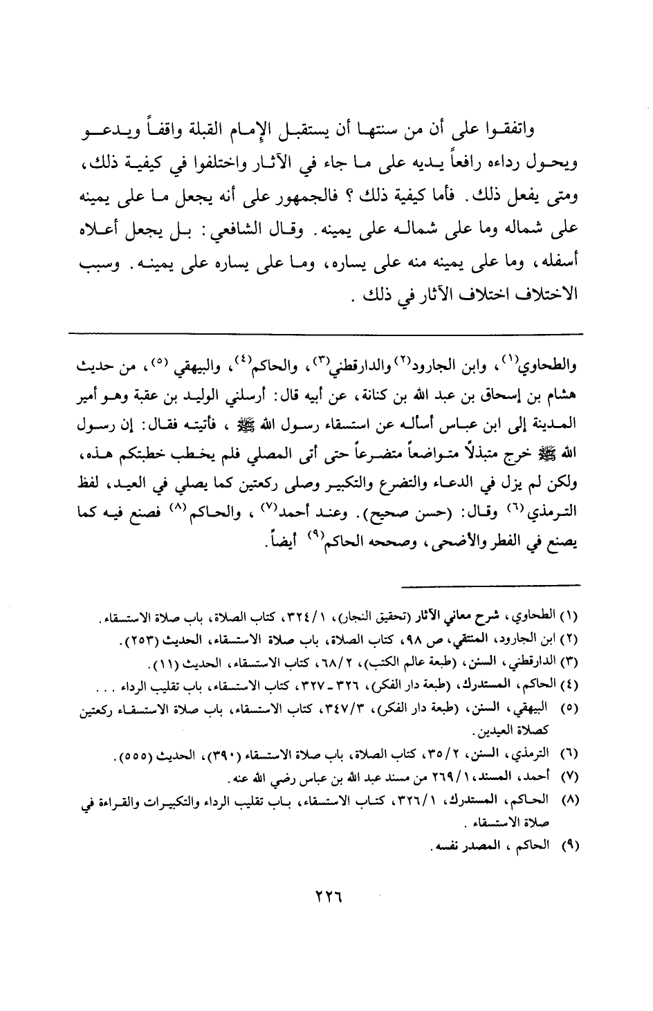 والطحاوي، وابن الجارود والدارقطني، والحاكم، والبيهقي، من حديث هشام بن إسحاق بن عبد الله بن كنانة، عن أبيه قال: أرسلني الوليد بن عقبة وهو أمير المدينة إلى ابن عباس أسأله عن استسقاء رسول الله - صلى الله عليه وسلم -، فأتيته فقال: إن رسول الله - صلى الله عليه وسلم - خرج متبذلًا متواضعًا متضرعًا حتى أتى المصلي فلم يخطب خطتكم هذه، ولكن لم يزل في الدعاء والتضرع والتكبير وصلى ركعتين كما يصلي في العيد، لفظ الترمذي وقال: (حسن صحيح). وعند أحمد، والحاكم فصنع فيه كما يصنع في الفطر والأضحى، وصححه الحاكم أيضًا.