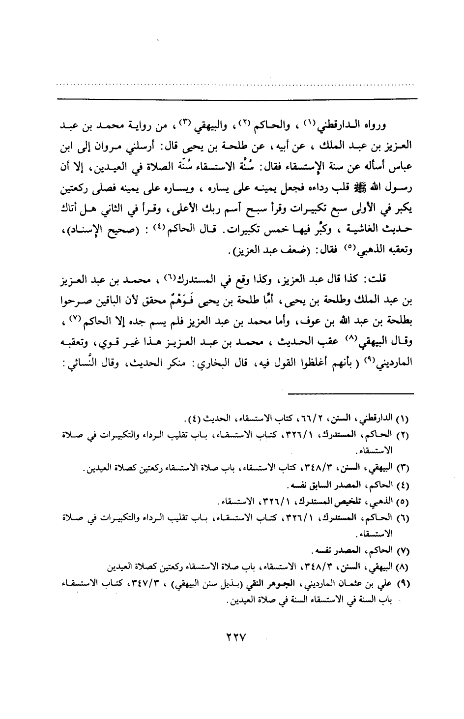 ورواه الدارقطني، والحاكم, والبيهقي، من رواية محمد بن عبد العزيز بن عبد الملك، عن أبيه، عن طلحة بن يحيى قال: أرسلني مروان إلى ابن عباس أسأله عن سنة الإِستسقاء فقال: سُنَّة الاستسقاء سُنّة الصلاة في العيدين، إلا أن رسول الله - صلى الله عليه وسلم - قلب رداءه فجعل يمينه على يساره، ويساره على يمينه فصلى ركعتين يكبر في الأولى سبع تكبيرات وقرأ سبح اسم ربك الأعلى، وقرأ في الثاني هل أتاك حديث الغاشية، وكبَّر فيها خمس تكبيرات. قال الحاكم: (صحيح الإِسناد)، وتعقبه الذهبي فقال: (ضعف عبد العزيز).