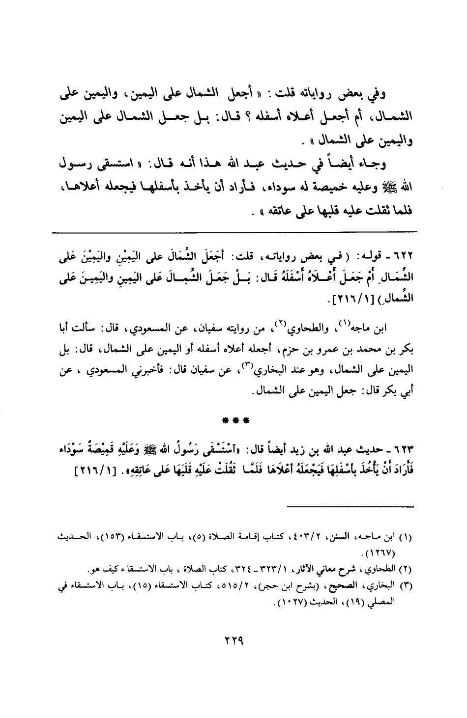 623 - حديث عبد الله بن زيد أيضًا قال: "اسْتَسْقَى رَسُولُ الله - صلى الله عليه وسلم - وَعَلَيْهِ قَمِيْصَةٌ سَوْدَاء فَأرَادَ أنْ يَأْخُذَ بأسْفَلِهَا فَيَجْعَلَهُ أعْلَاهَا فَلَمَّا ثَقُلَتْ عَلَيْهِ قَلَبَهَا عَلى عَاتِقِهِ".