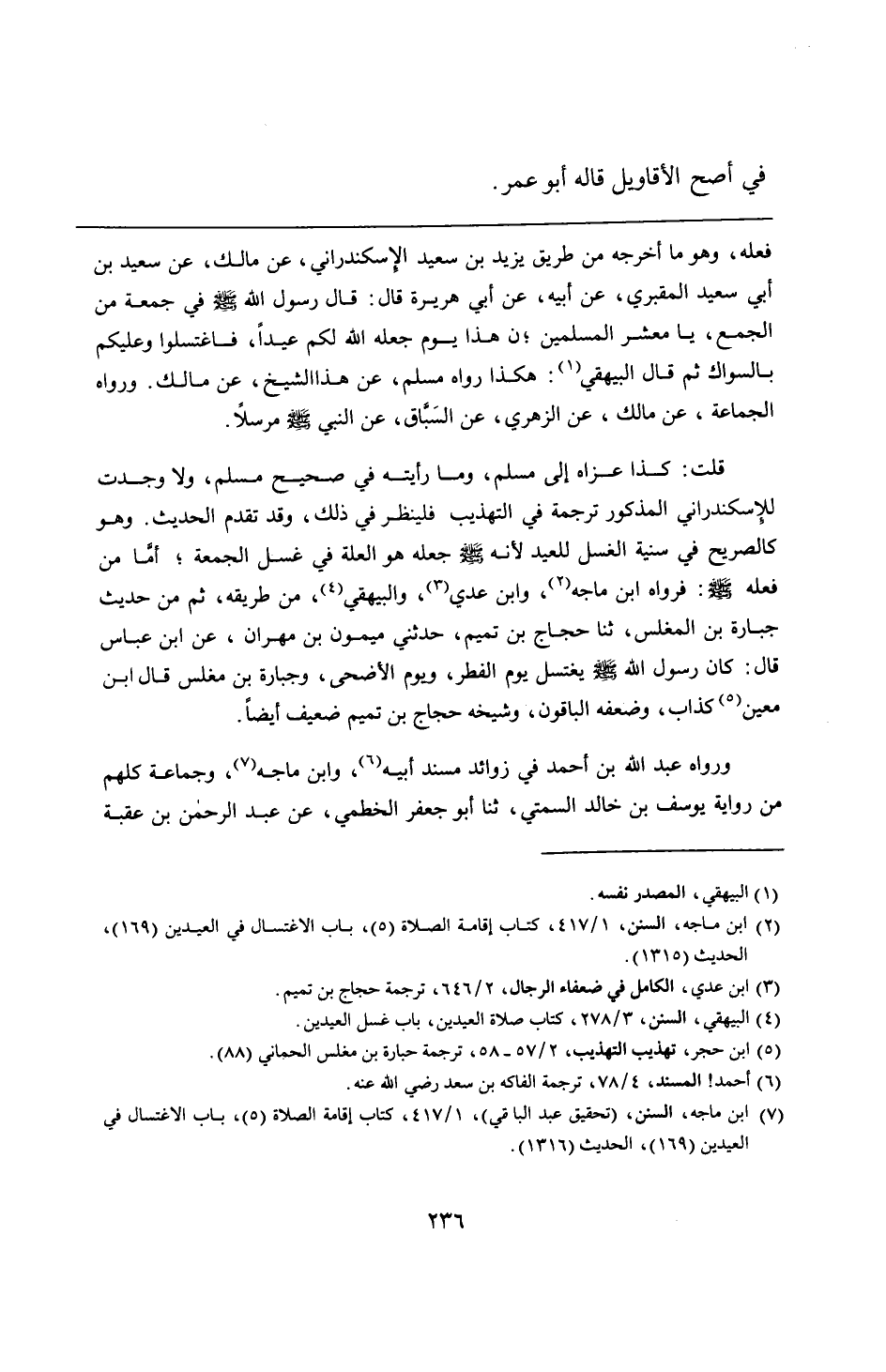 قلت: كذا عزاه إلى مسلم، وما رأيته في صحيح مسلم، ولا وجدت للإسكندراني المذكور ترجمة في التهذيب فلينظر في ذلك، وقد تقدم الحديث. وهو كالصريح في سنية الغسل للعيد لأنه - صلى الله عليه وسلم - جعله هو العلة في غسل الجمعة؛ أمَّا من فعله - صلى الله عليه وسلم -: فرواه ابن ماجه، وابن عدي، والبيهقي، من طريقه، ثم من حديث جبارة بن المغلس، ثنا حجاج بن تميم، حدثني ميمون بن مهران، عن ابن عباس قال: كان رسول الله - صلى الله عليه وسلم - يغتسل يوم الفطر، ويوم الأضحى، وجبارة بن مغلس قال ابن معين كذاب، وضعفه الباقون، وشيخه حجاج بن تميم ضعيف أيضًا.