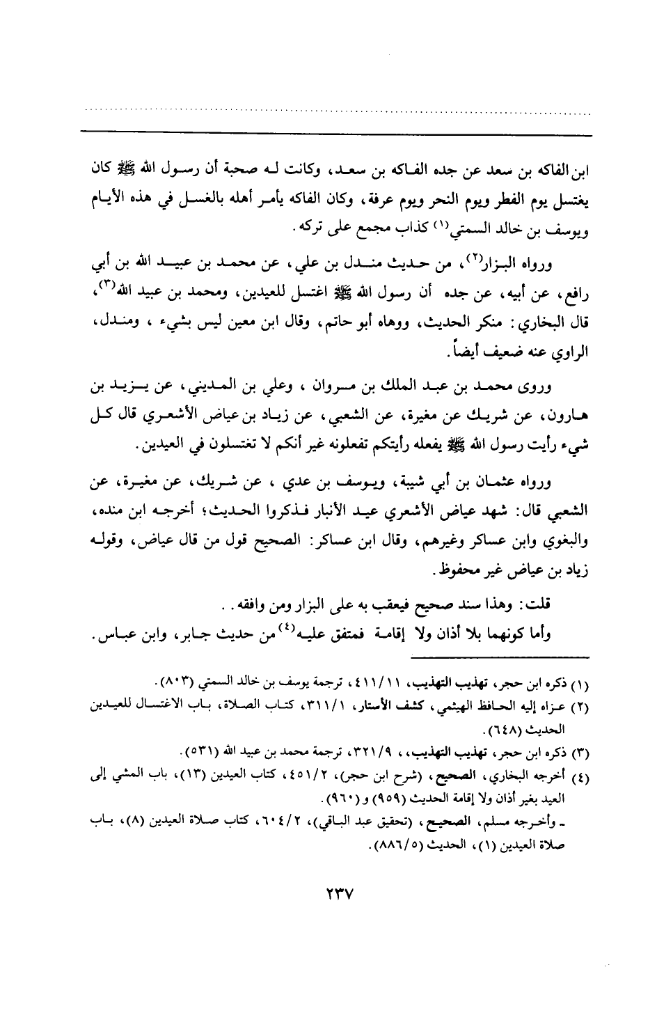 ابن الفاكه بن سعد عن جده الفاكه بن سعد، وكانت له صحبة أن رسول الله - صلى الله عليه وسلم - كان يغتسل يوم الفطر ويوم النحر ويوم عرفة، وكان الفاكه يأمر أهله بالغسل في هذه الأيام ويوسف بن خالد السمتي كذاب مجمع على تركه.