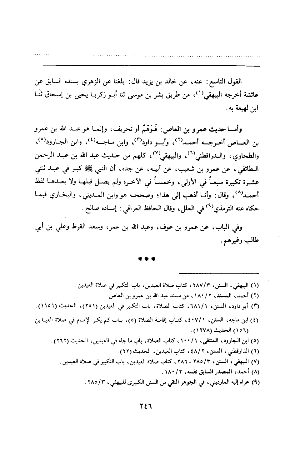 وأما حديث عمرو بن العاص: فَوَهْمٌ أو تحريف، وإنما هو عبد الله بن عمرو بن العاص أخرجه أحمد، وأبو داود، وابن ماجه، وابن الجارود، والطحاوي، والدارقطني، والبيهقي، كلهم من حديث عبد الله بن عبد الرحمن الطائفي، عن عمرو بن شعيب، عن أبيه، عن جده، أن النبي - صلى الله عليه وسلم - كبر في عيد ثنتي عشرة تكبيرة سبعًا في الأولى، وخمسًا في الآخرة ولم يصل قبلها ولا بعدها لفظ أحمد، وقال: وأنا أذهب إلى هذا؛ وصححه هو وابن المديني، والبخاري فيما حكاه عنه الترمذي في العلل، وقال الحافظ العراقي: إسناده صالح.