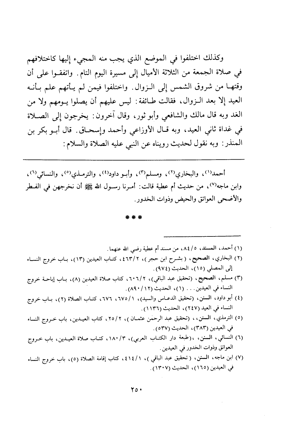 أحمد، والبخاري، ومسلم، وأبو داود، والترمذي، والنسائي، وابن ماجه، من حديث أم عطية قالت: أمرنا رسول الله - صلى الله عليه وسلم - أن نخرجهن في الفطر والأضحى العواتق والحيض وذوات الخدور.