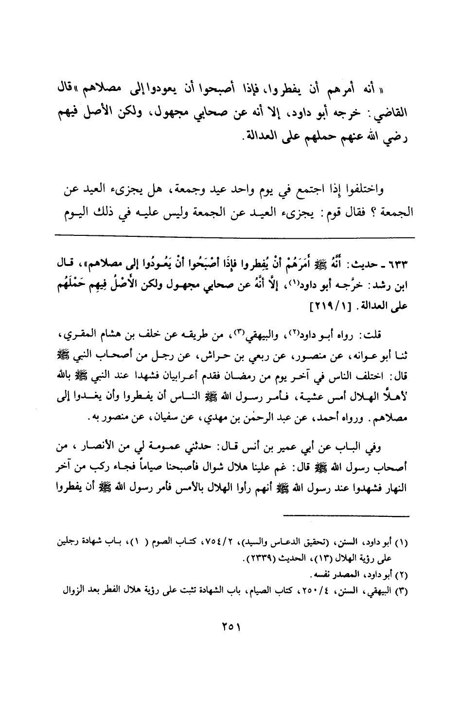 633 - حديث: أنَّهُ - صلى الله عليه وسلم - أَمَرَهُمْ أنْ يُفِطروا فإذَا أصْبَحُوا أنْ يَعُودُوا إلى مصلاهم"، قال ابن رشد: خرَّجه أبو داود، إلَّا أنَّهُ عن صحابي مجهول ولكن الأَصْلُ فِيهِم حَمْلَهُم على العدالة.