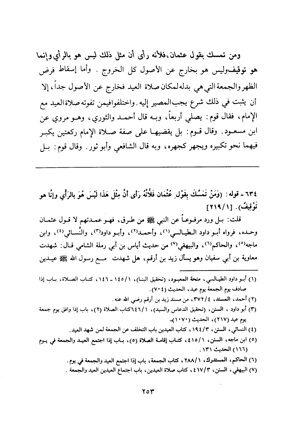 قلت: بل ورد مرفوعًا عن النبي - صلى الله عليه وسلم - من طرق، فهو عمدتهم لا قول عثمان وحده، فرواه أبو داود الطيالسي، وأحمد، وأبو داود، والنَّسائي، وابن ماجه، والحاكم، والبيهقي من حديث أياس بن أبي رملة الشامي قال: شهدت معاوية بن أبي سفيان وهو يسأل زيد بن أرقم، هل شهدت مع رسول الله - صلى الله عليه وسلم - عيدين