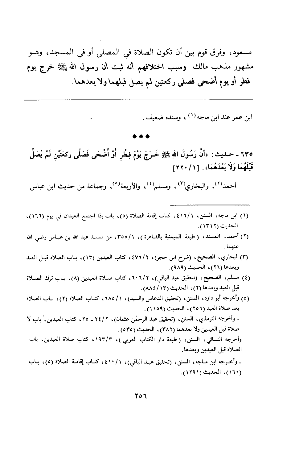 635 - حديث: "أنَّ رَسُولَ اللهِ - صلى الله عليه وسلم - خَرَجَ يَوْمَ فِطْرٍ أوْ أَضْحَى فَصَلَّى ركعَتَيْنِ لَمْ يُصَلِّ قَبْلَهُمَا وَلَا بَعْدَهُمَا".