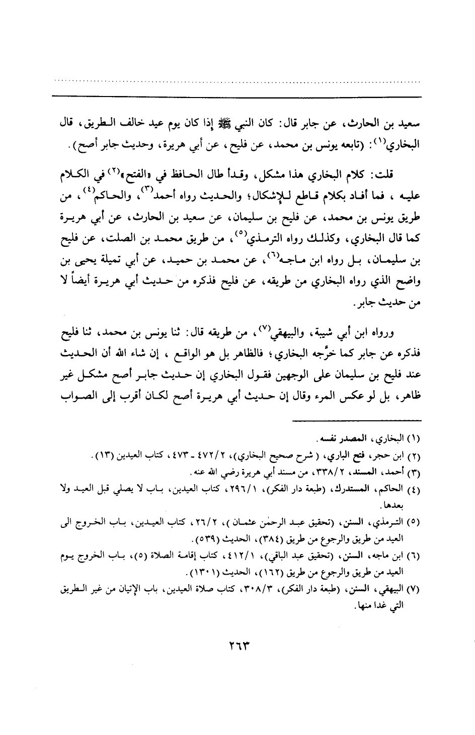 سعيد بن الحارث، عن جابر قال: كان النبي - صلى الله عليه وسلم - إذا كان يوم عيد خالف الطريق، قال البخاري: (تابعه يونس بن محمد، عن فليح، عن أبي هريرة، وحديث جابر أصح).