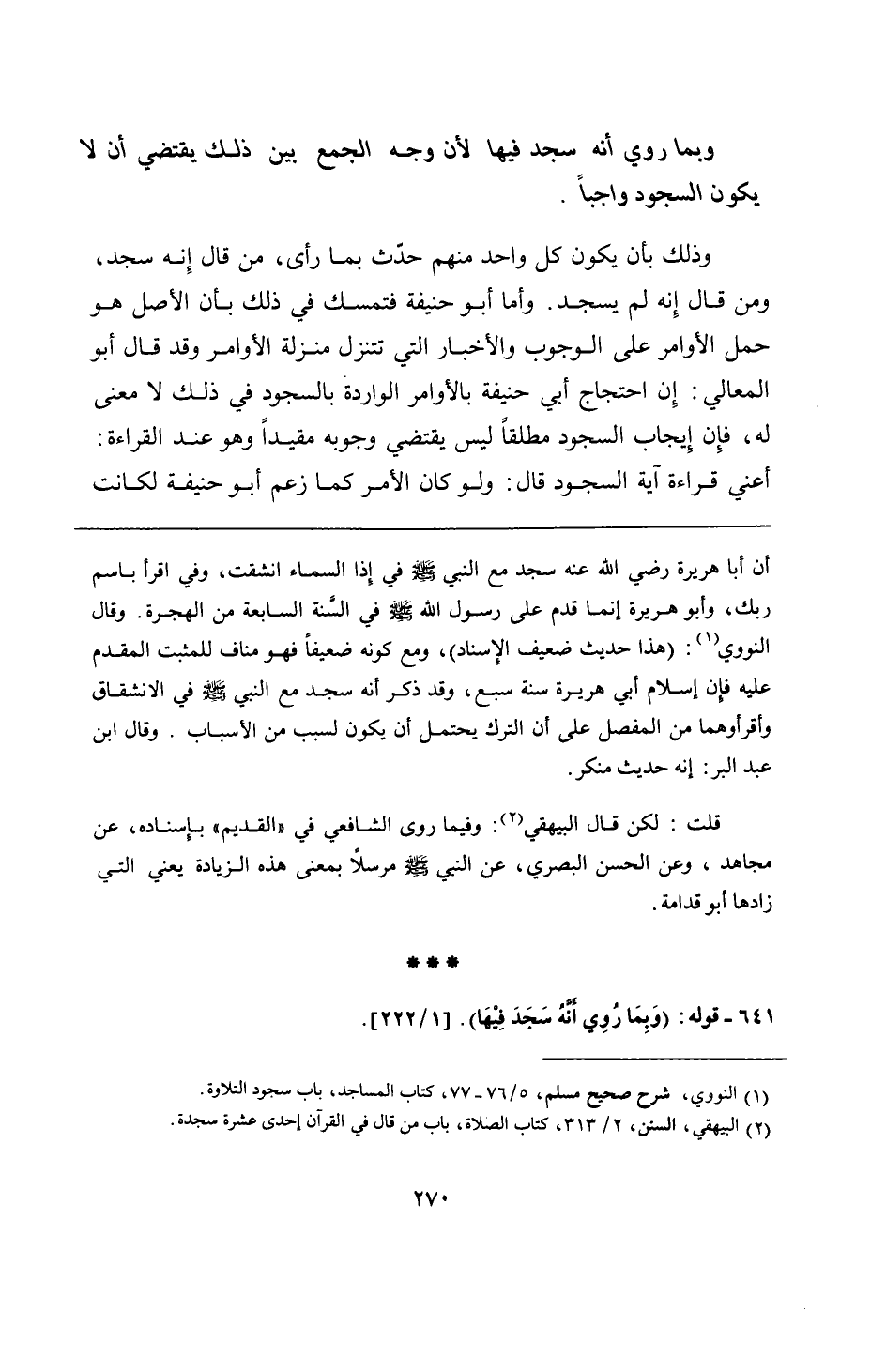 أن أبا هريرة - رضي الله عنه - سجد مع النبي - صلى الله عليه وسلم - في إذا السماء انشقت، وفي اقرأ باسم ربك، وأبو هريرة إنما قدم على رسول الله - صلى الله عليه وسلم - في السَّنة السابعة من الهجرة. وقال النووي: (هذا حديث ضعيف الإسناد)، ومع كونه ضعيفًا فهو مناف للمثبت المقدم عليه فإن إسلام أبي هريرة سنة سبع، وقد ذكر أنه سجد مع النبي - صلى الله عليه وسلم - في الانشقاق وأقرأوهما من المفصل على أن الترك يحتمل أن يكون لسبب من الأسباب. وقال ابن عبد البر: إنه حديث منكر.