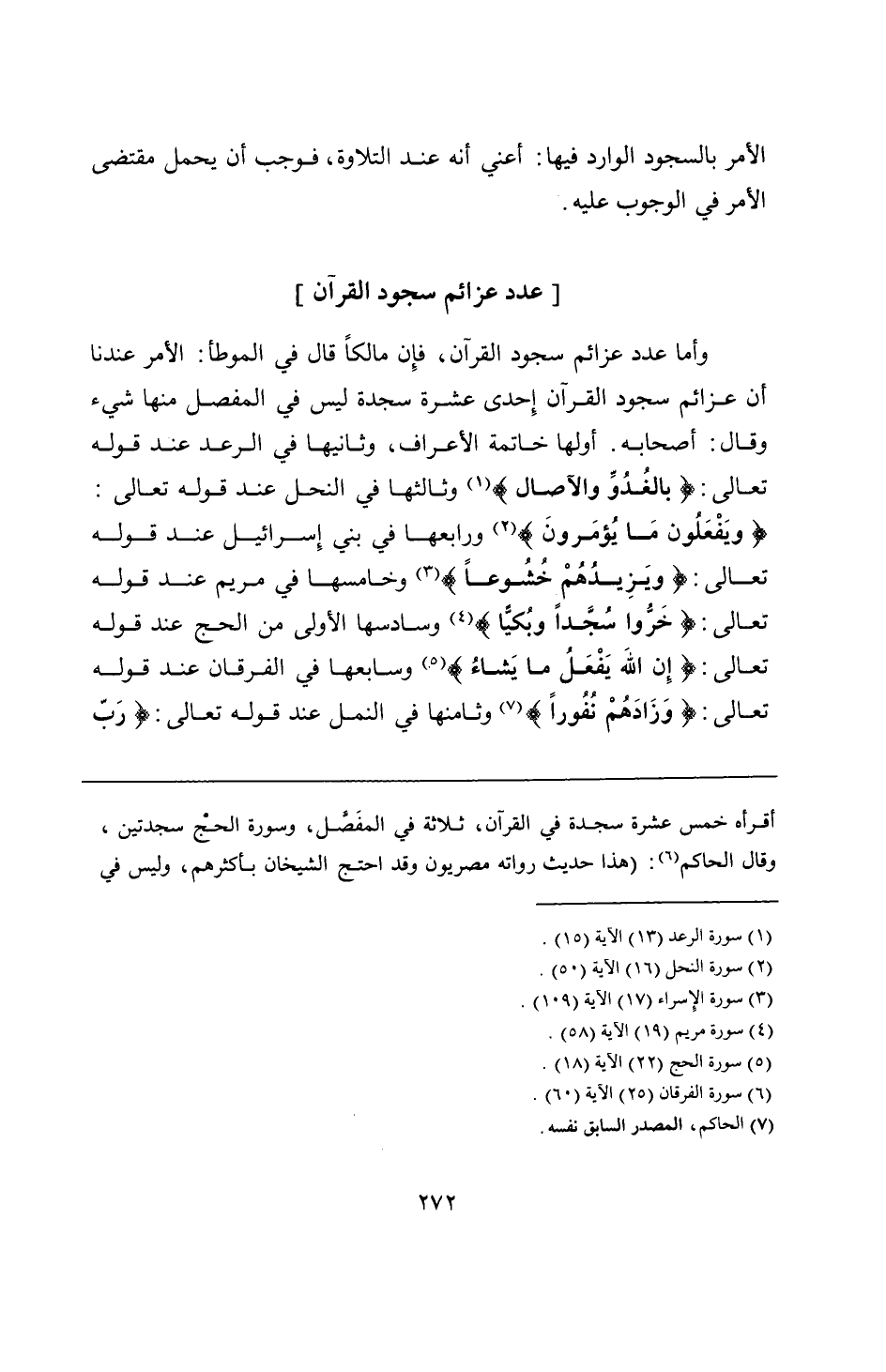 أقرأه خمس عشرة سجدة في القرآن، ثلاثة في المفَصَّل، وسورة الحجْ سجدتين، وقال الحاكم: (هذا حديث رواته مصريون وقد احتج الشيخان بأكثرهم، وليس في